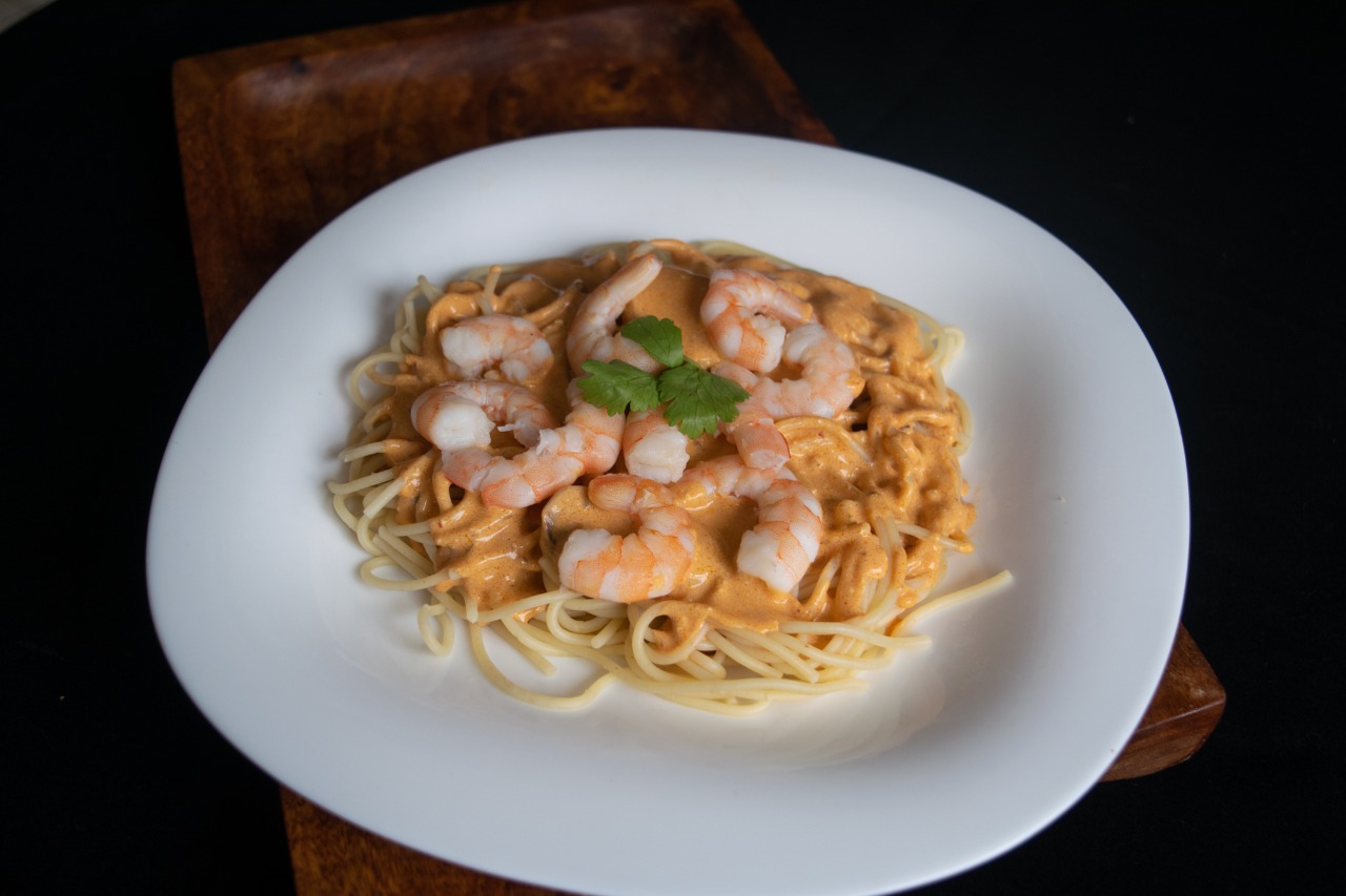 Espagueti con camarones bañado en crema de chipotle y champiñones.