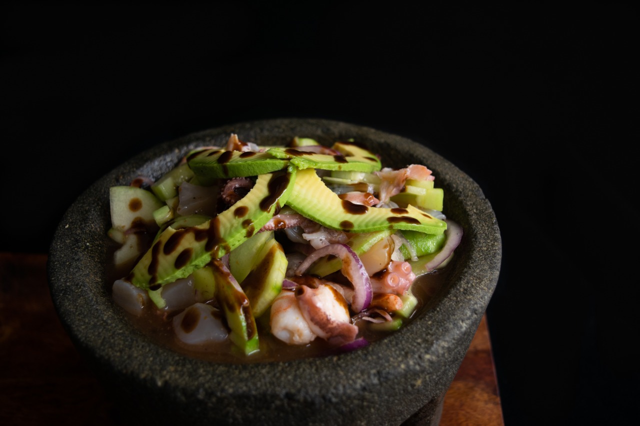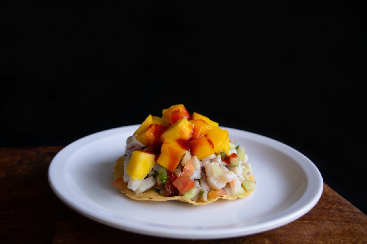 Ceviche de pescado con mango y chamoy.