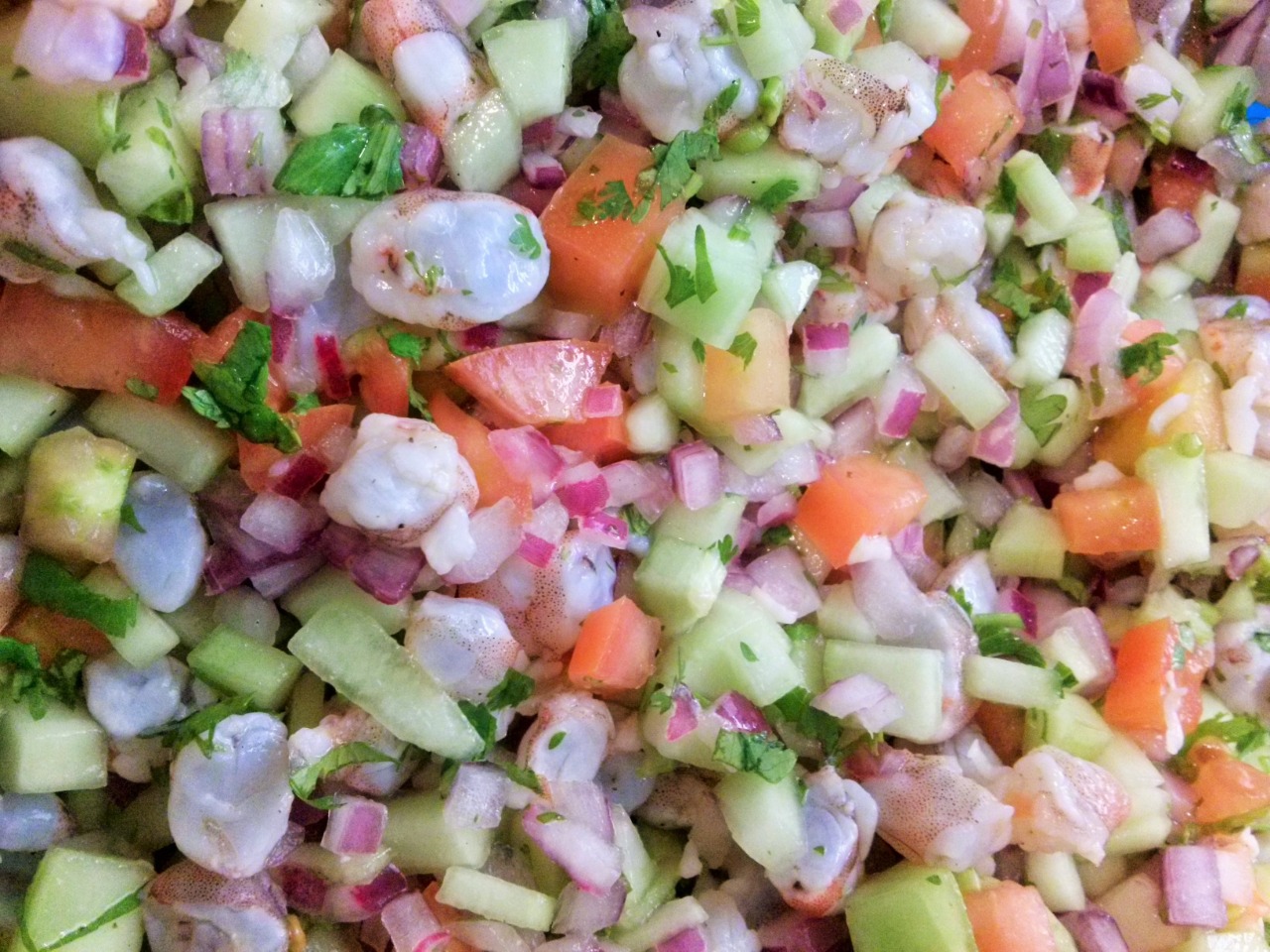 Camarón crudo curtido con limón, mezclado con pepino, cebolla, tomate y cilantro.