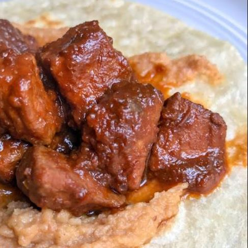 Burrito con exquisito asado de puerco, con tortilla de harina, acompañado con salsa.
