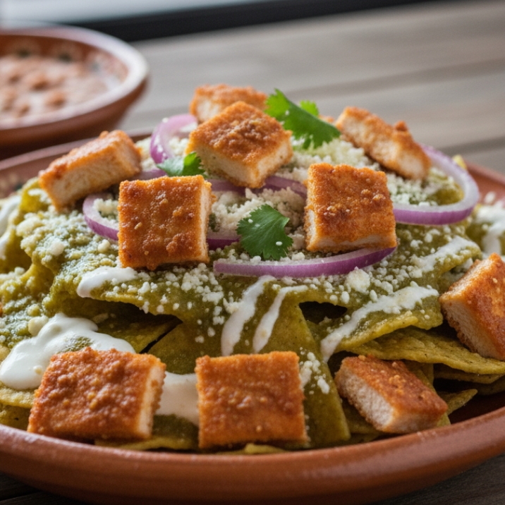 Chilaquiles verdes con queso, crema, cuadritos de pechuga de pollo empanizados .