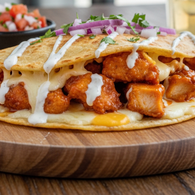 Quesadilla grande en tortilla de harina de 19 CM con cuadritos de pechuga de pollo empanizados, en cama de queso chihuahua,acompañados de salsa
