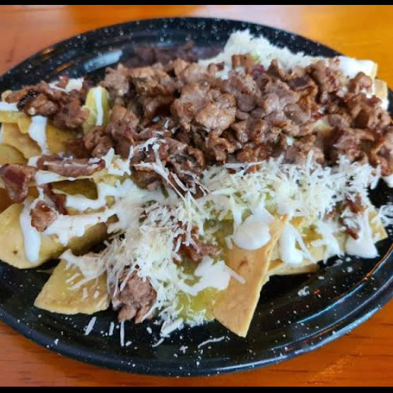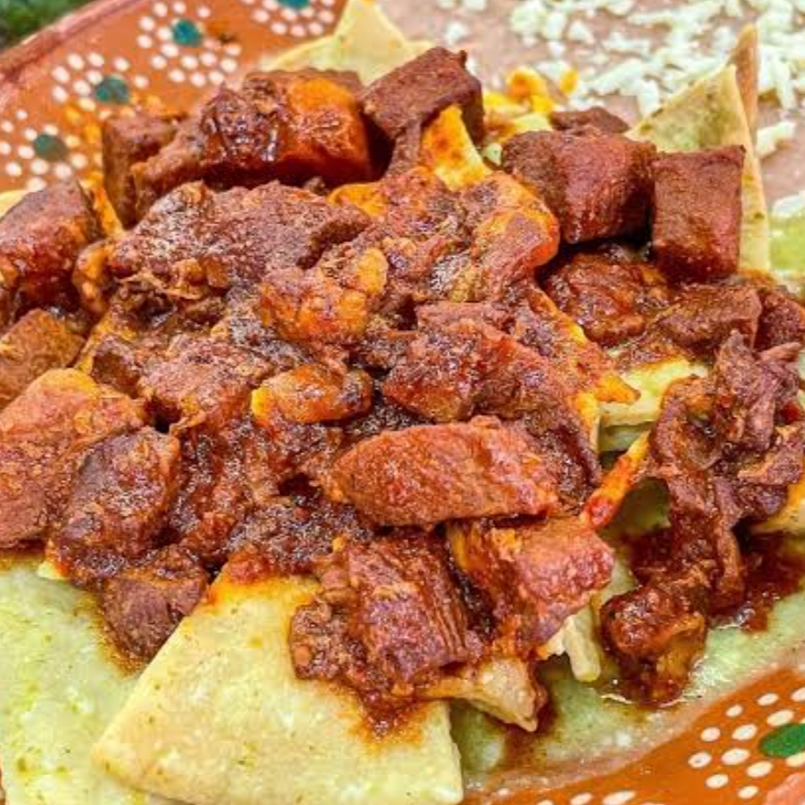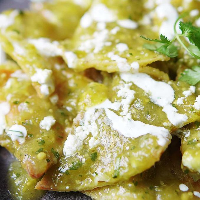 Deliciosos totopos bañados en salsa verde casera, crema y quesito chihuahua fundido.