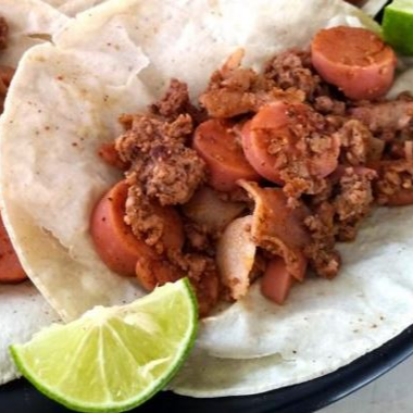 5 tacos de discada en tortilla de maiz , acompañados de salsa y limon