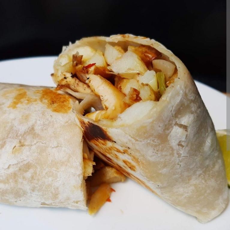 Burrito de harina en tortilla de 19 CM relleno de queso chihuahua y cuadritos de pechuga de pollo empanizada, acompañado de salsa