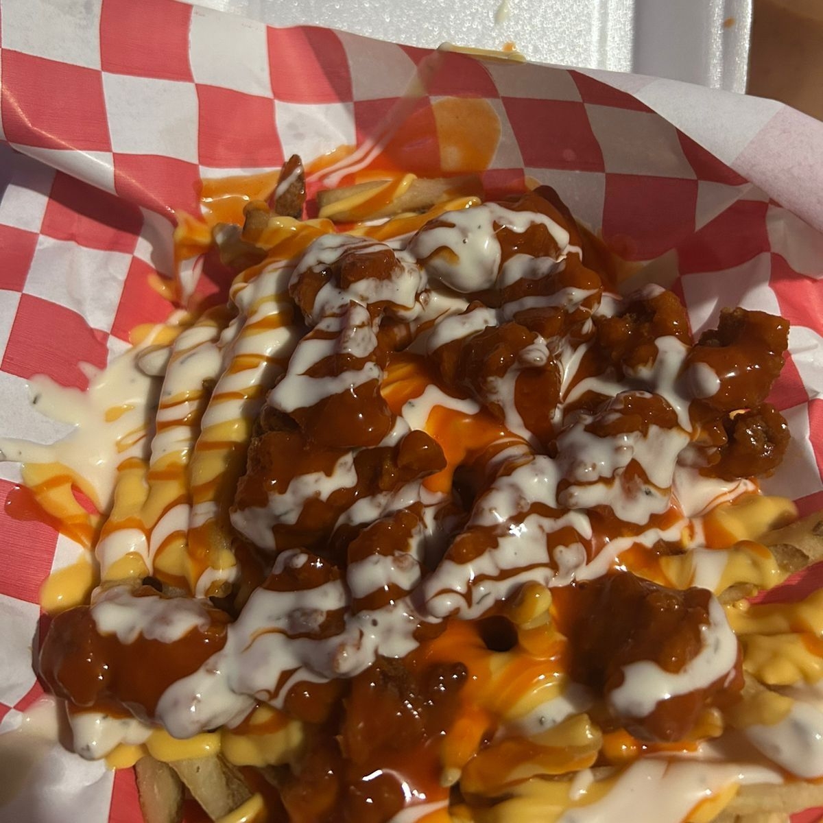 250g De papas bañadas en queso, salsa búfalo, aderezo rancho y tocino ahumado.