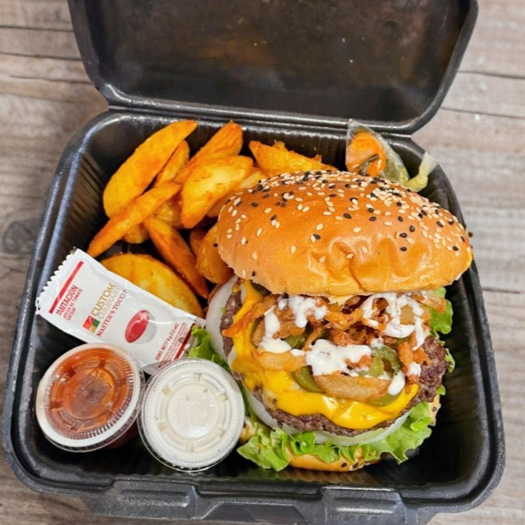 Pan de Hamburguesa Tradicional con ranch, lechuga, tomate, cebolla, 200 gr de Carne de res sazonada, queso gouda, queso americano jalapeño encurtido cebolla crunchy y mas aderezo ranch. Acompañado con papas gajo y aderezos
