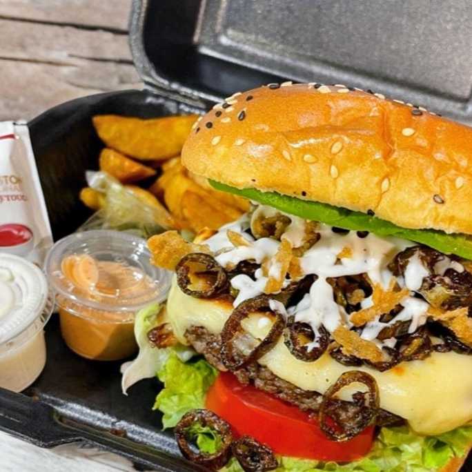 Pan de hamburguesa tradicional con Mayo-crema y especias, lechuga, 200 gr de carne de res sazonada, mantequilla de ajo-parmesano y cebolla frita. Acompañada de papas gajo y aderezos