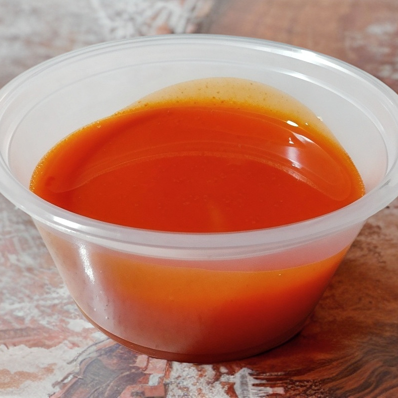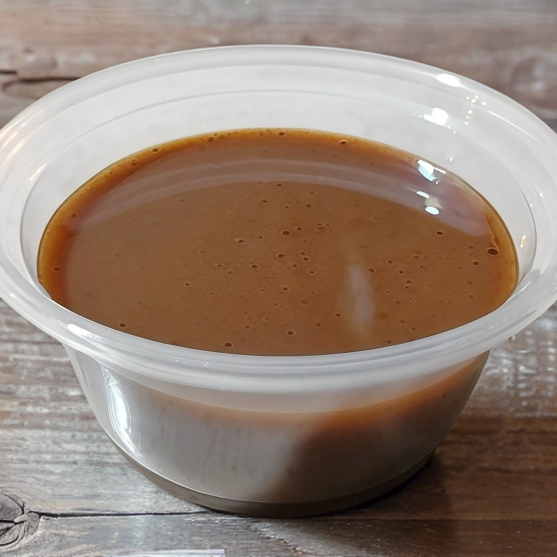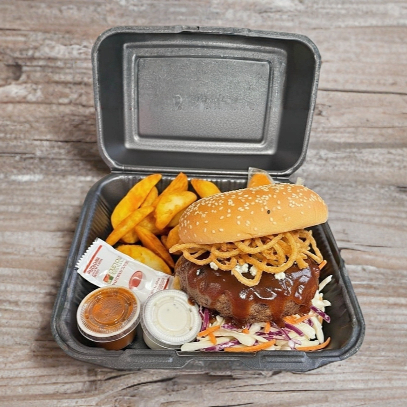 Pan tradicional con ranch, ensalada de repollo, 200 gr de carne de res sazonada, salsa BBQ, queso azul, Cebollita cruncy y mas bbq. Acompañada de papas gajo y aderezos