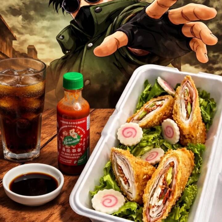 Por dentro: Queso crema, aguacate, sirlon y tocino. Por fuera: Empanizado con toping de boneles bañados en salsa de tu preferencia