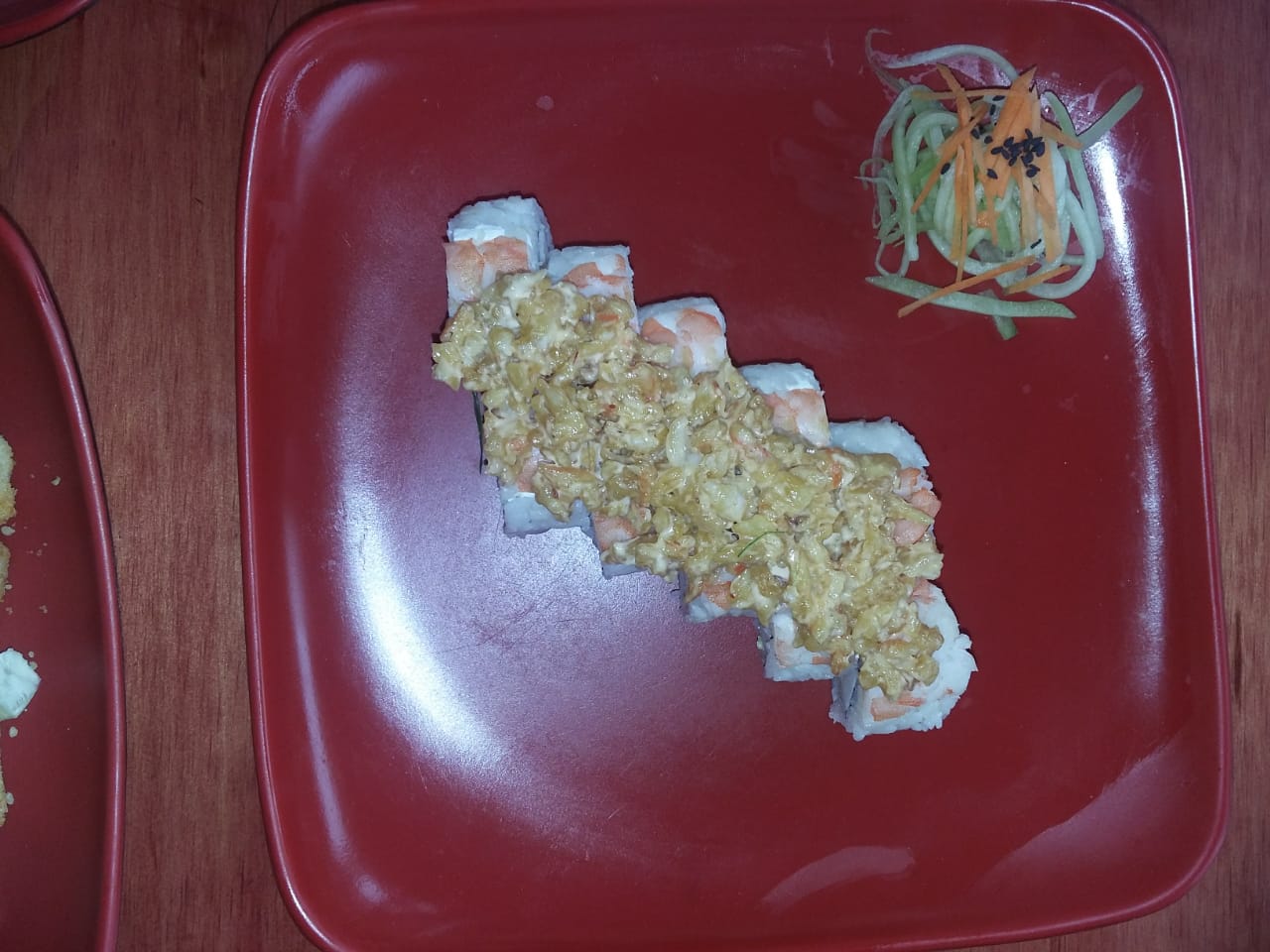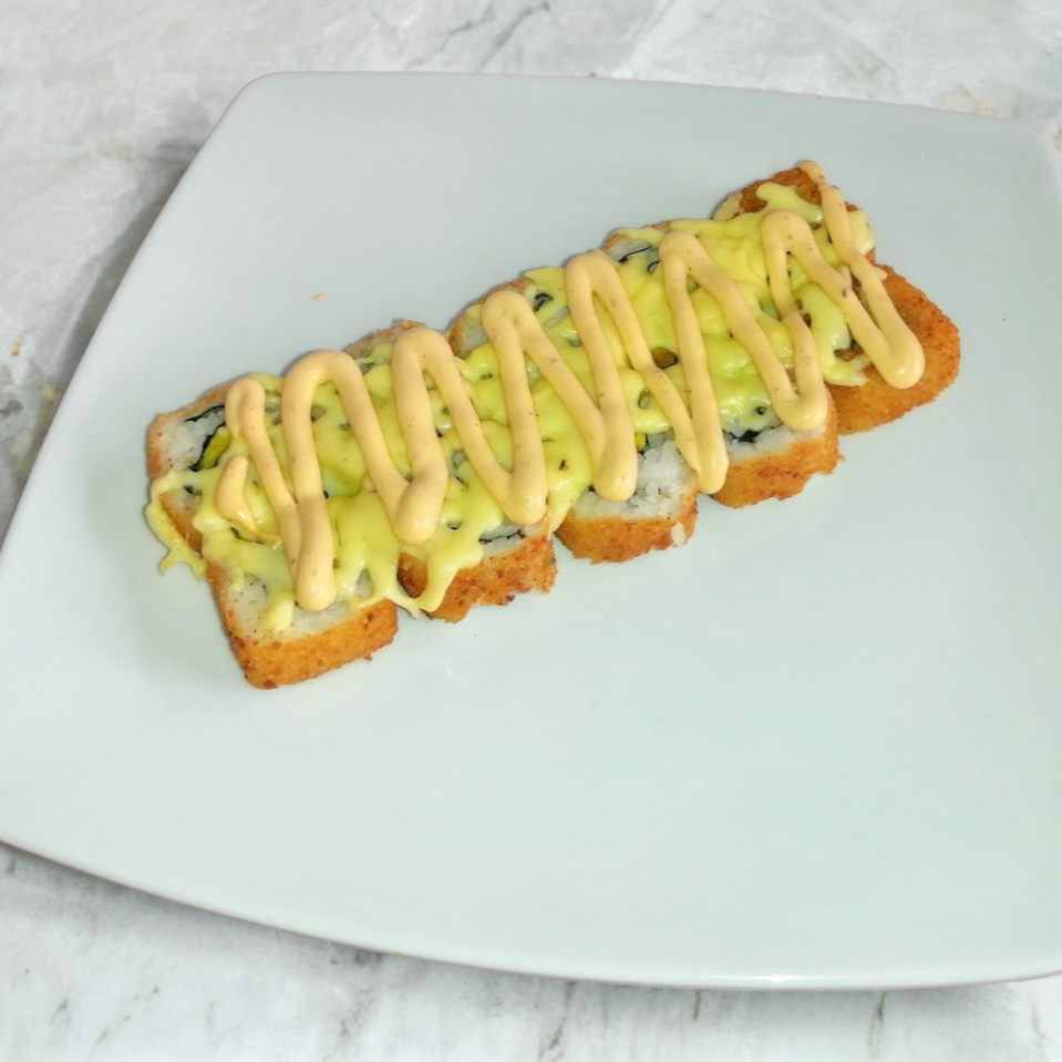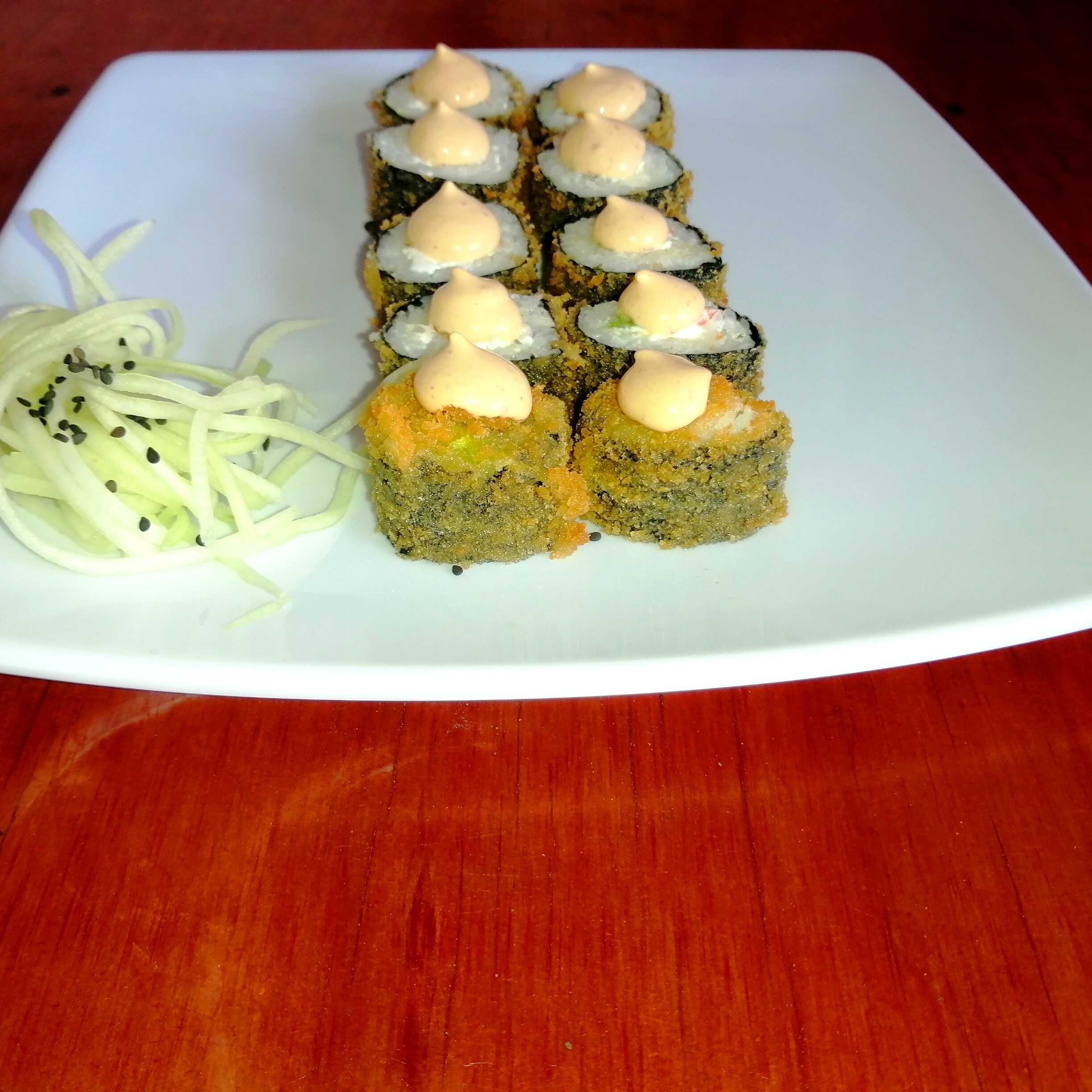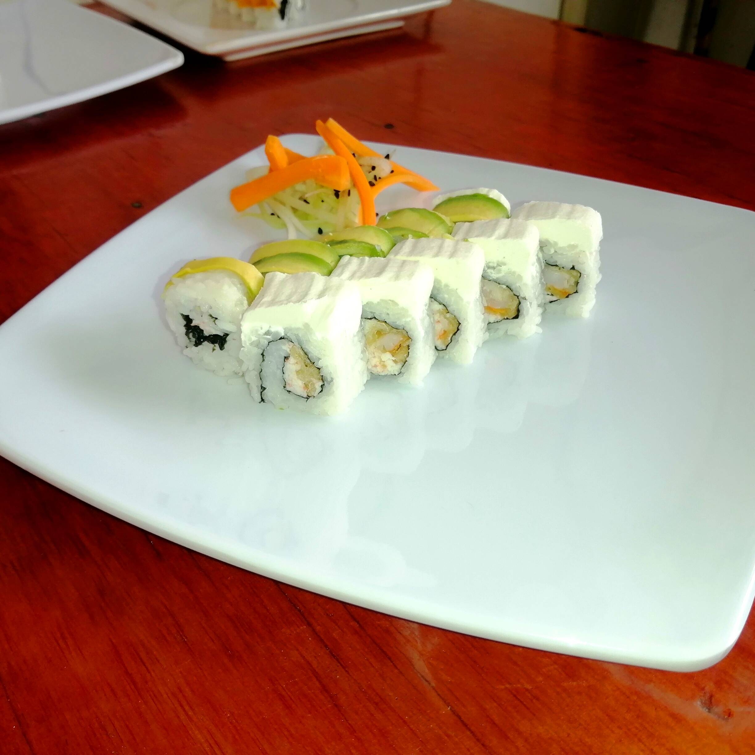 Base de una cama de arroz japonés, camarón roca, aguacate, queso crema, pepino y aderezo chipotle.