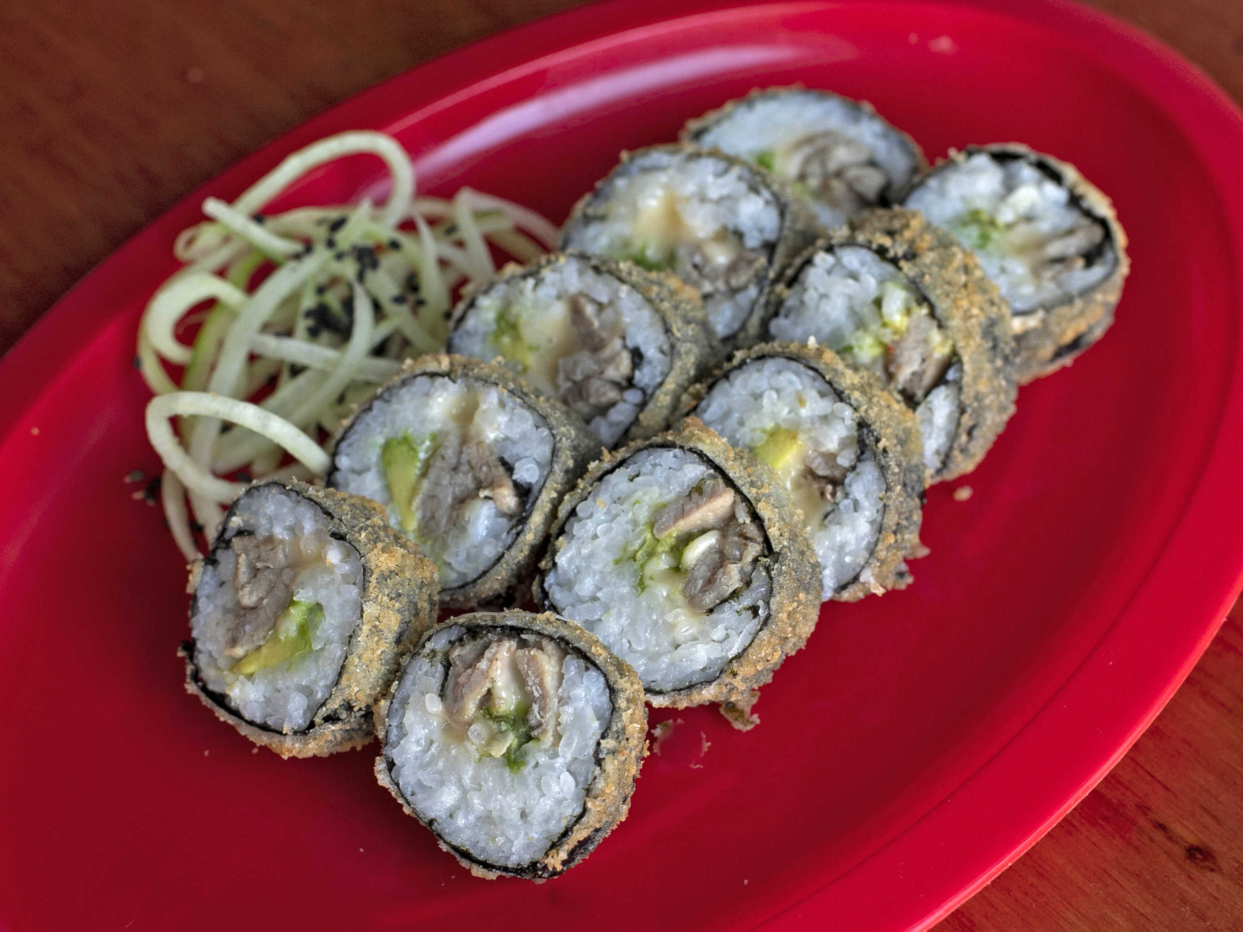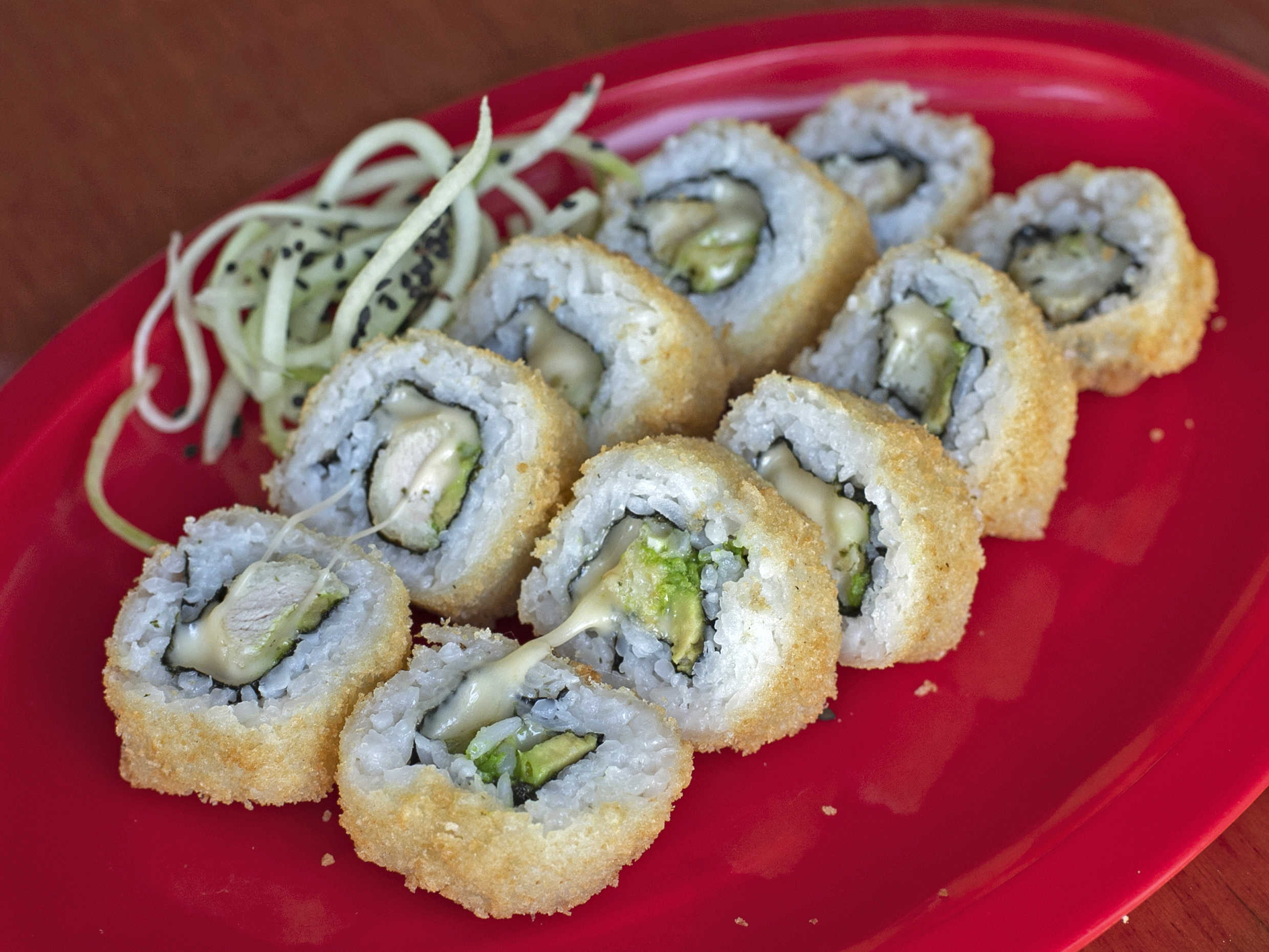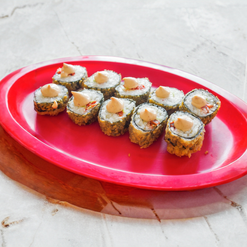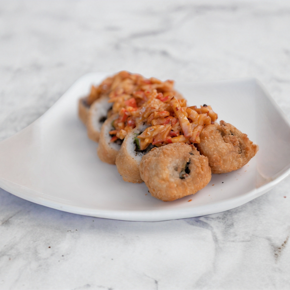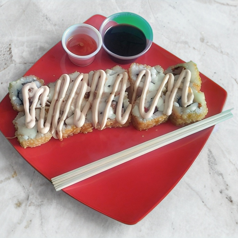 Base de una cama de arroz japonés, camarón roca, aguacate, queso crema, pepino y aderezo chipotle.