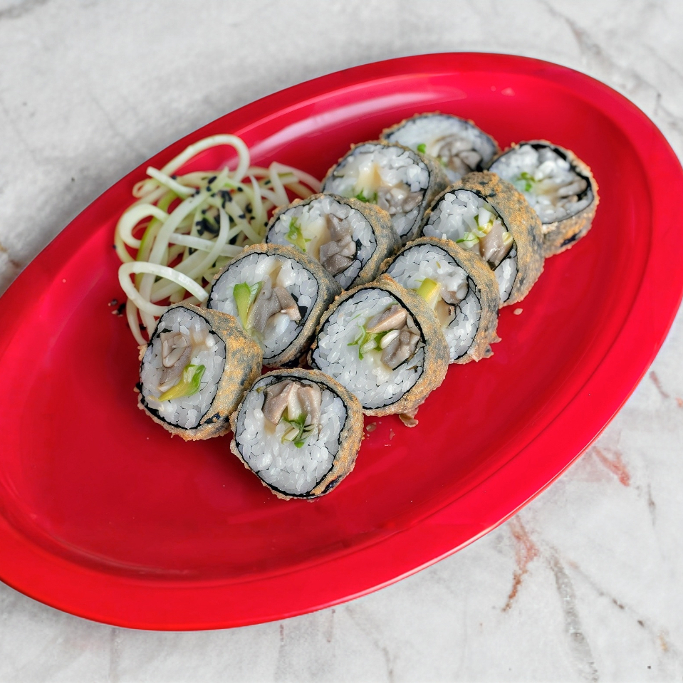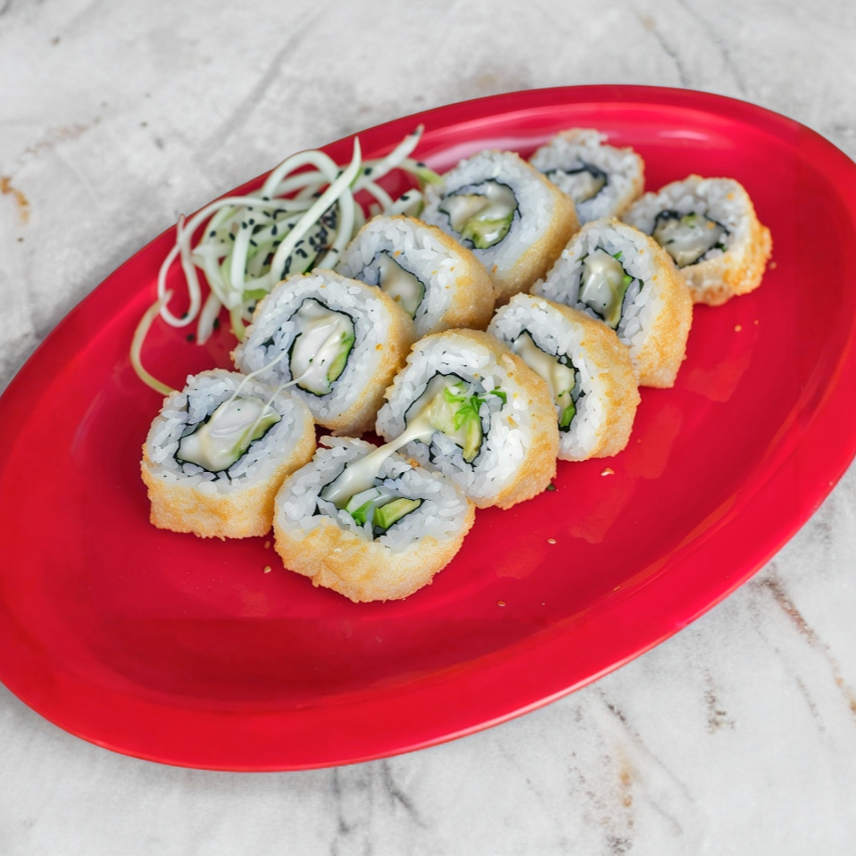 Aguacate, queso crema, zanahoria y pepino por dentro, por fuera ajonjolí.