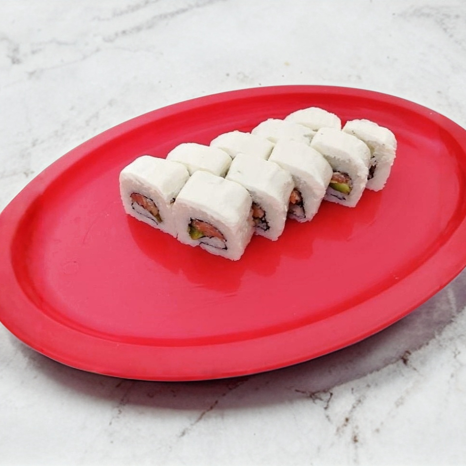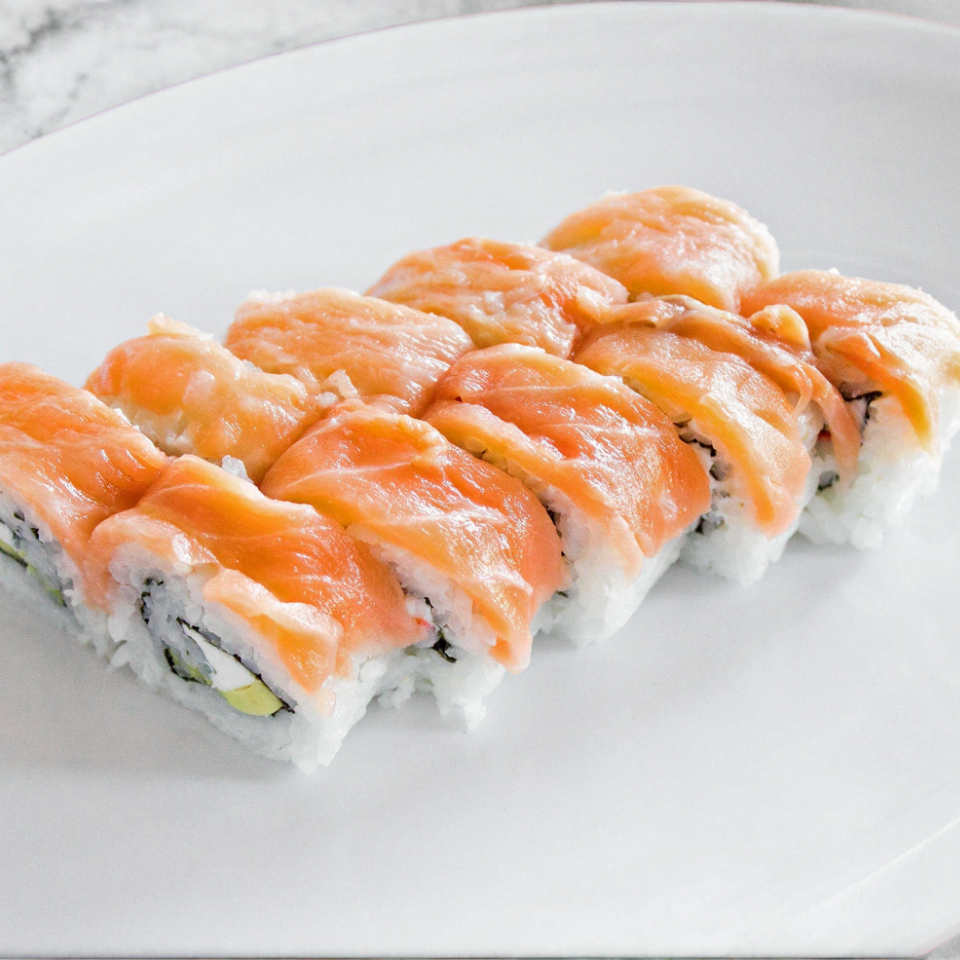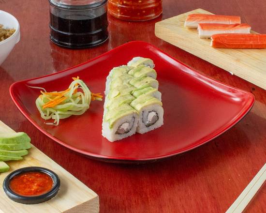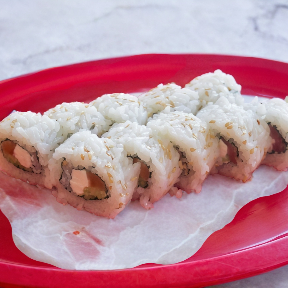 Surimi, queso crema, pepino, aguacate por dentro decorado con salmón.