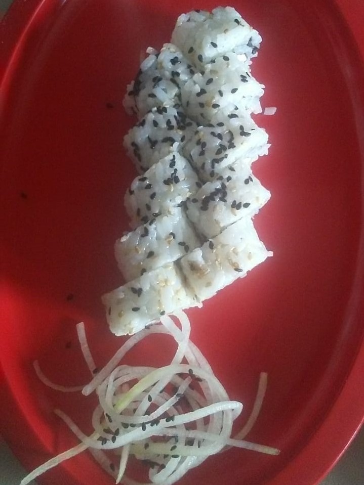 Salmón, pepino, queso crema por dentro, y ajonjolí por fuera.