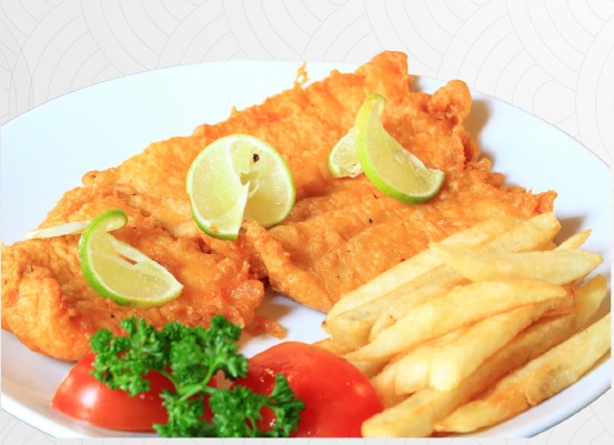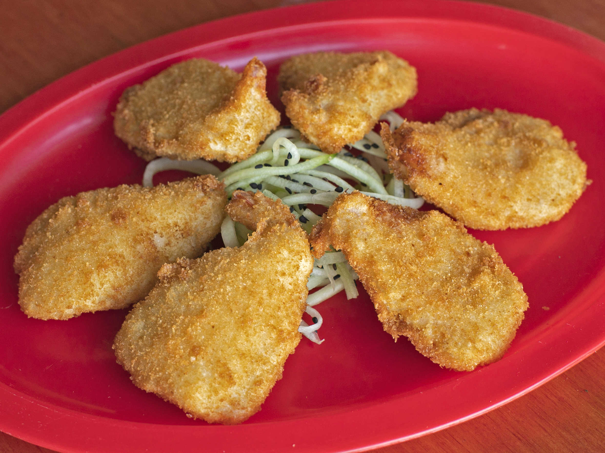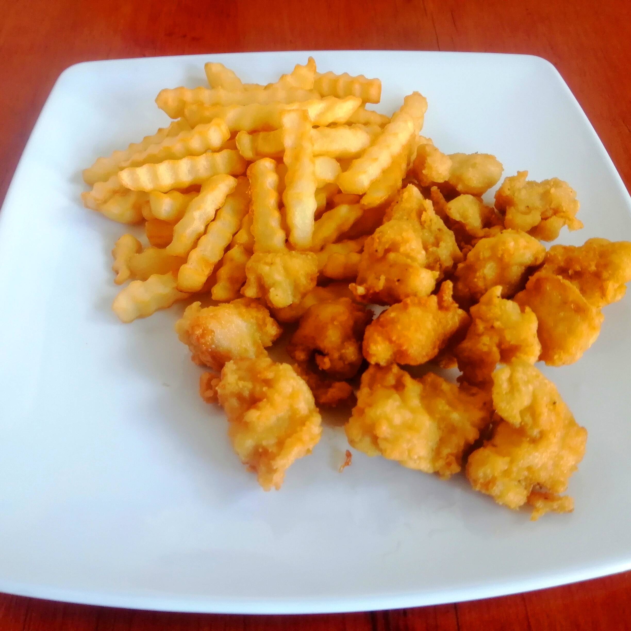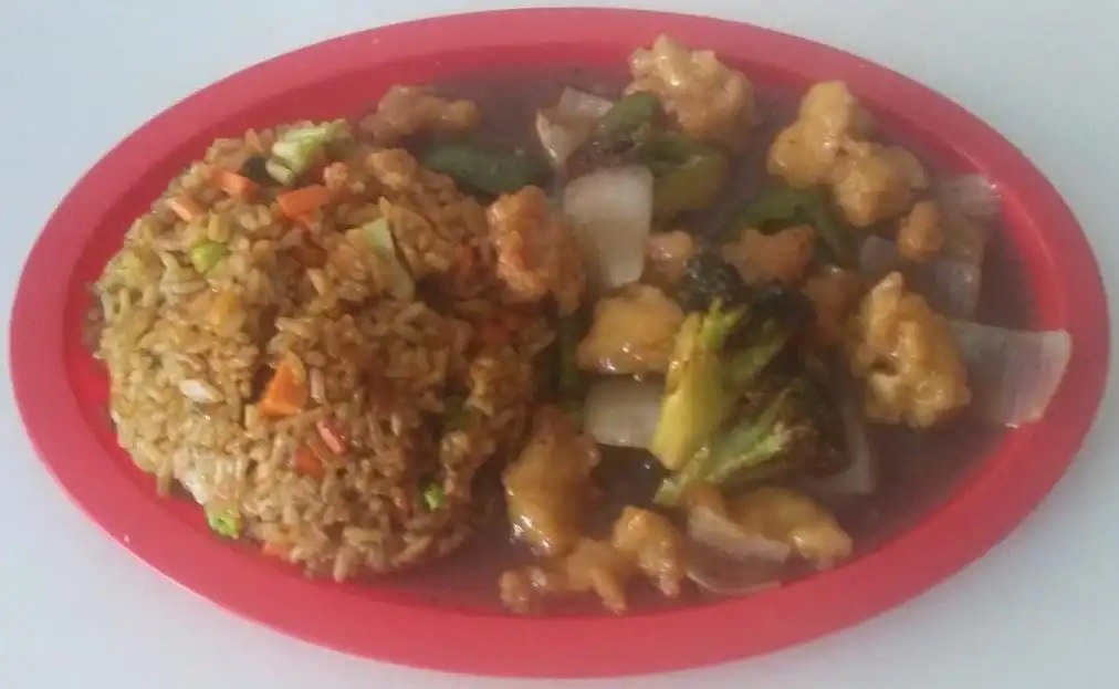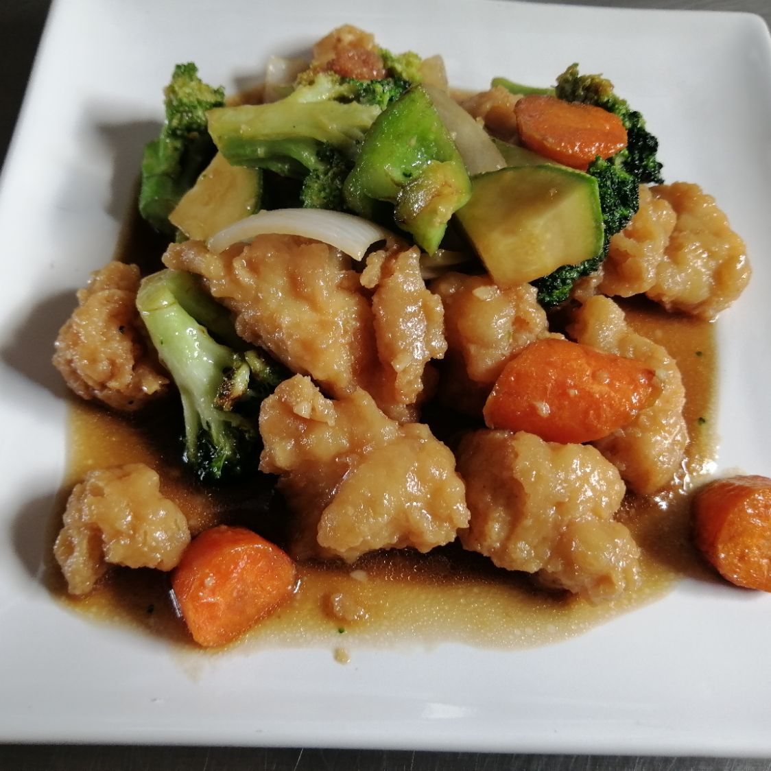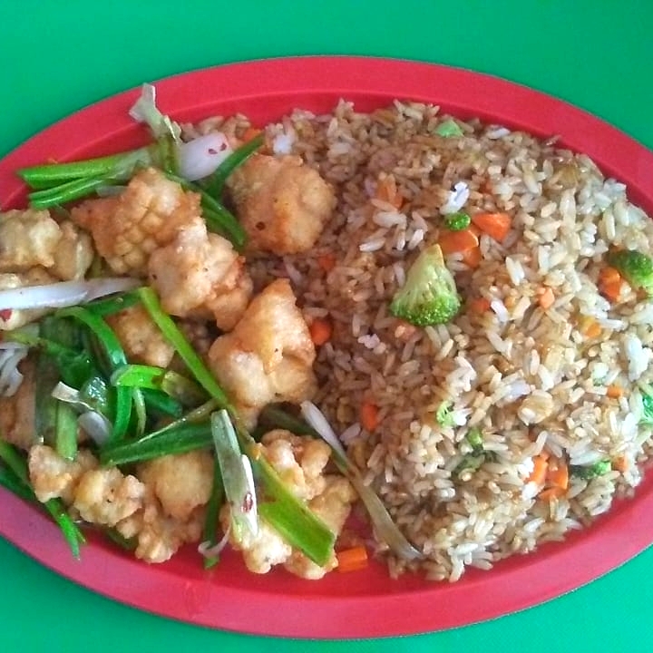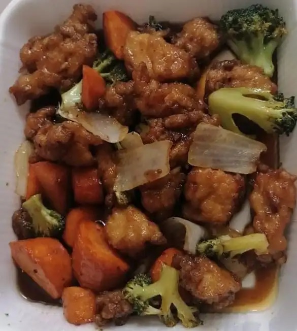 Pollo capeado con salsa dulce picante, cebolla blanca y zanahoria.