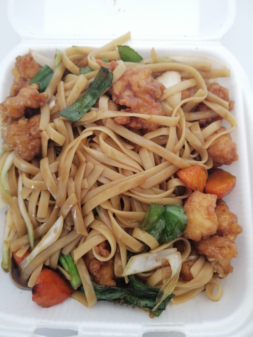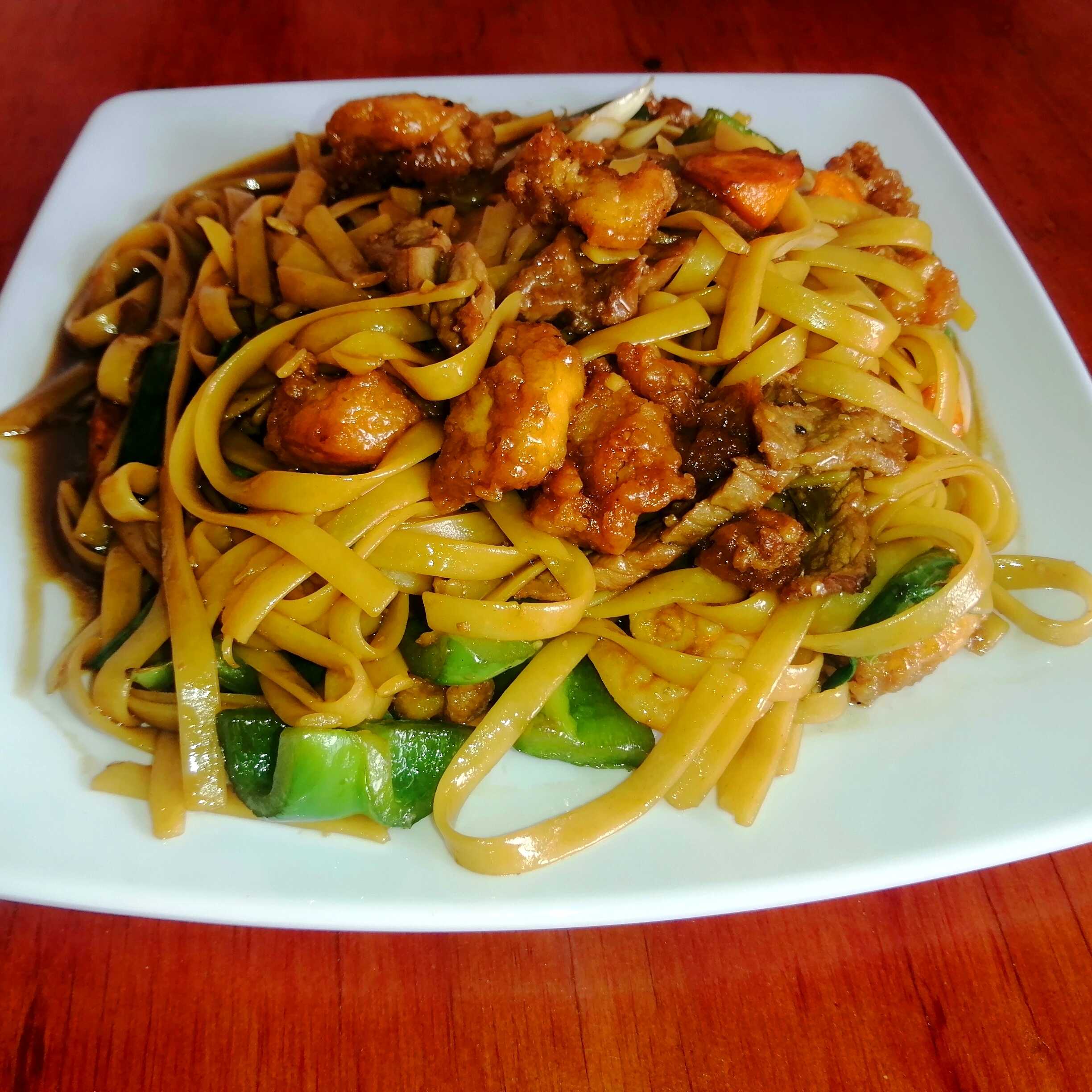 Delicioso tallarines con carne, pollo, camarón en salsa de ostión zanahoria, morrón y cebolla cambray.