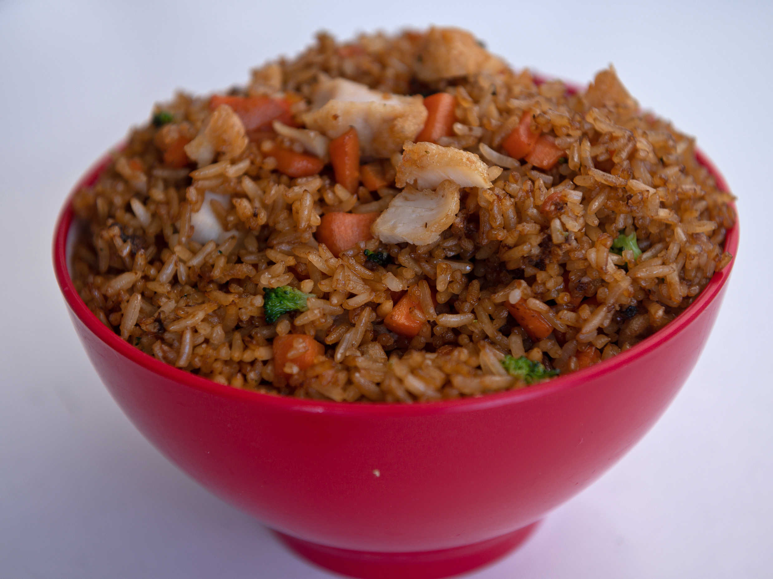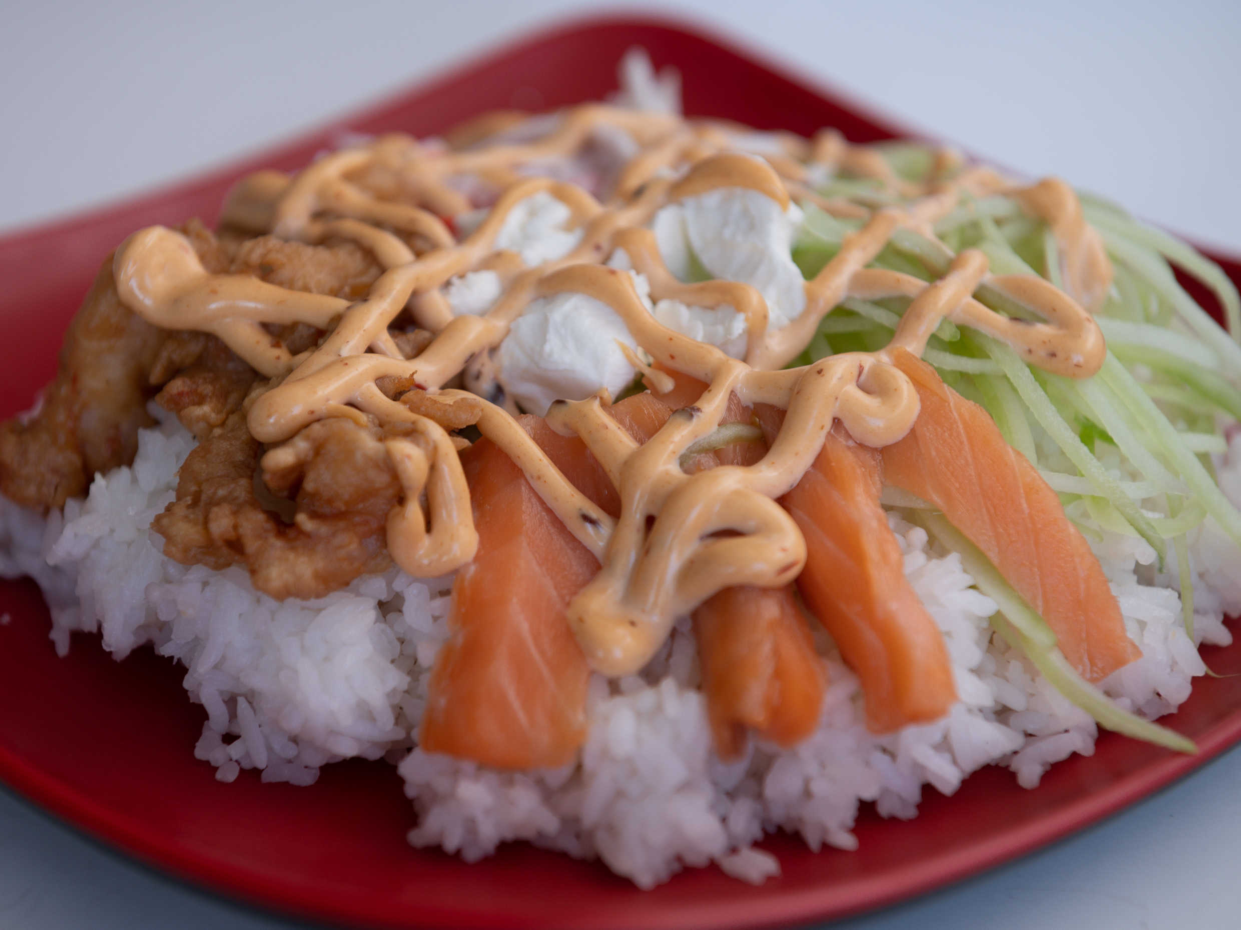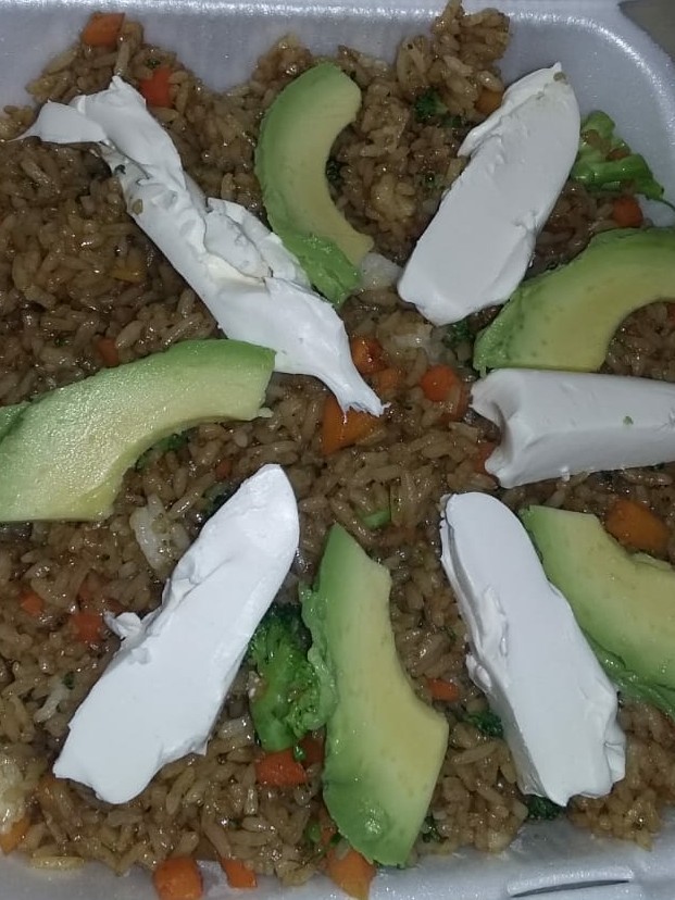 Arroz frito, aguacate, queso manchego y pollo con un toque de salsa sambal.