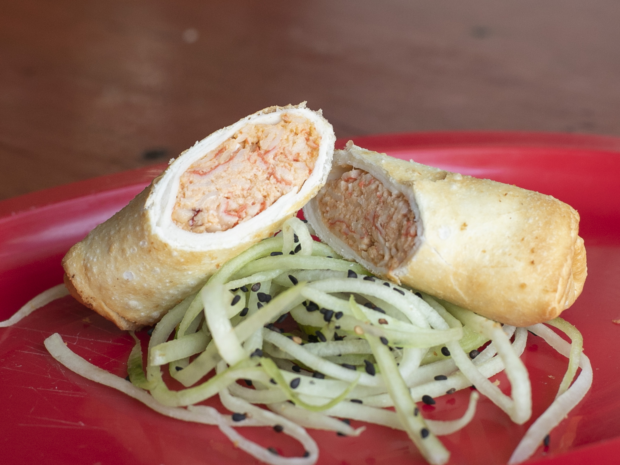Por dentro surimi, aguacate, queso crema, por fuera camarón con surimi crujiente.