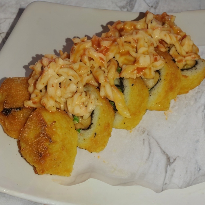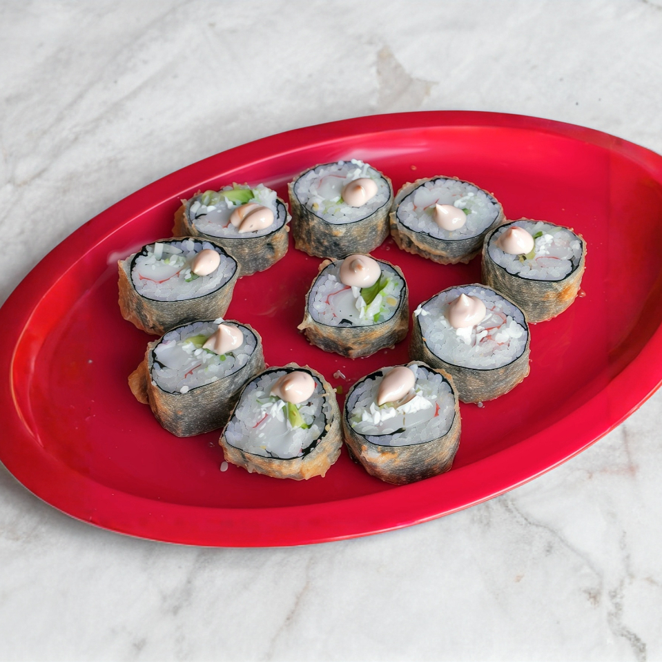 Servido en una cama de arroz japones, camarón, témpora, surimi, salmón, queso, crema, pepino con aderezo chipotle.
