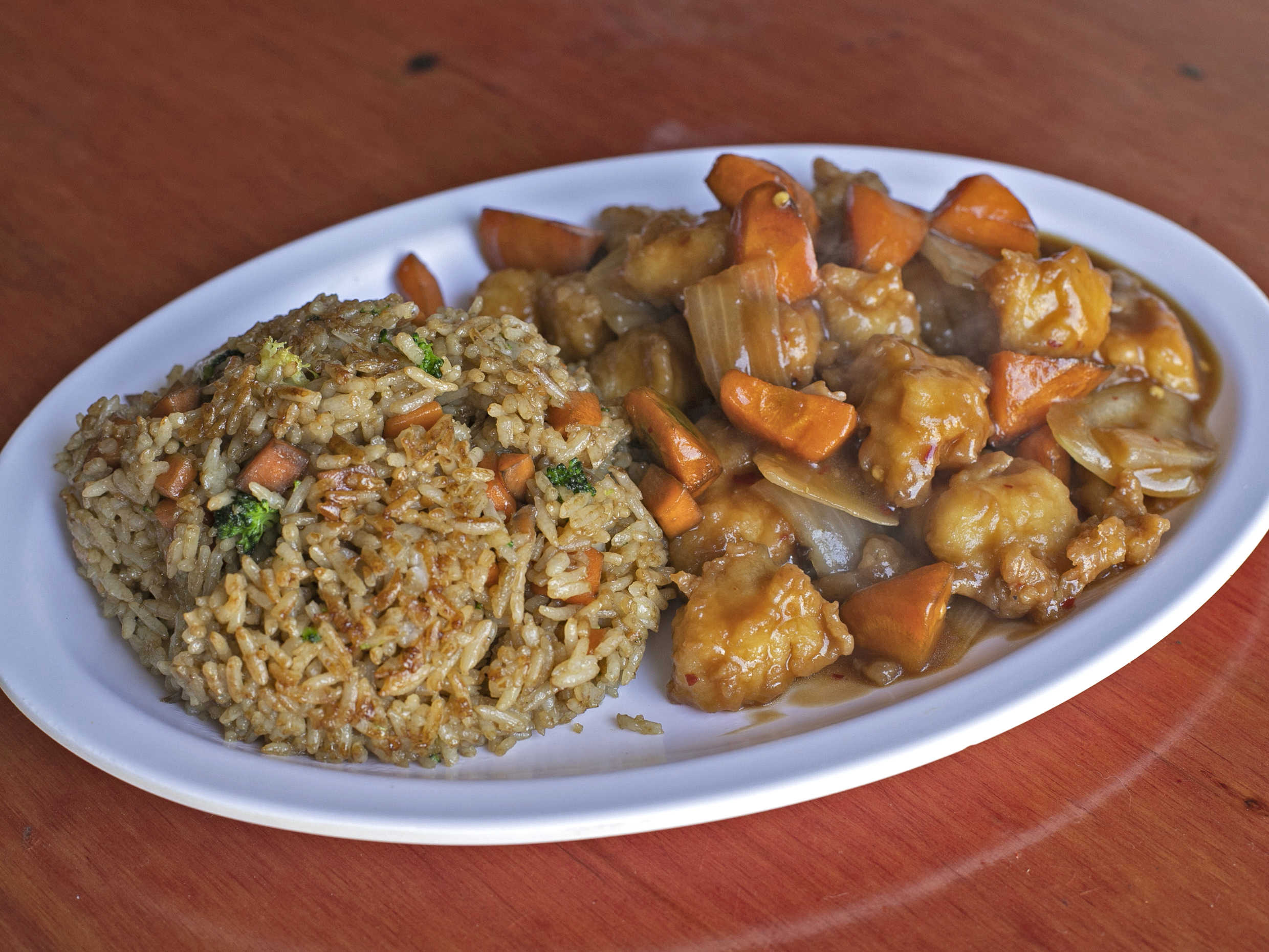 Salsa agridulce, morrón verde, zanahoria, cebolla blanca y piña.
