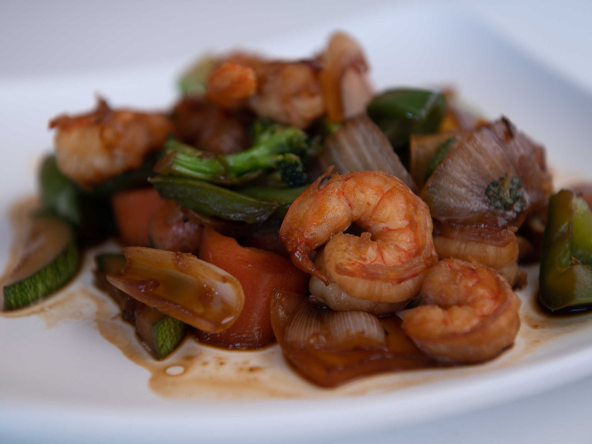 Carne bañada en salsa guajillo, apio, pimiento verde, zanahoria y cebolla cambray.
