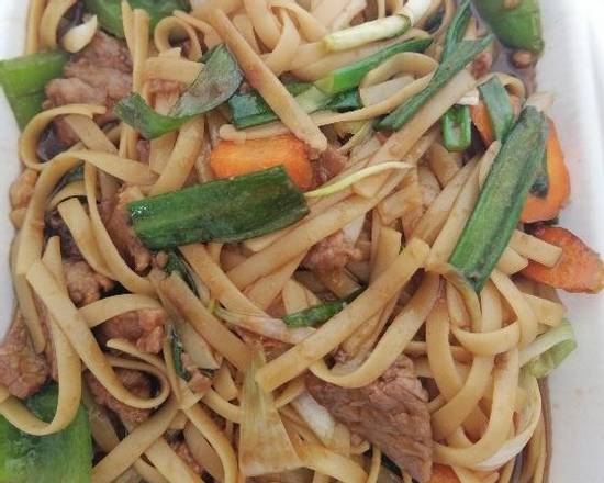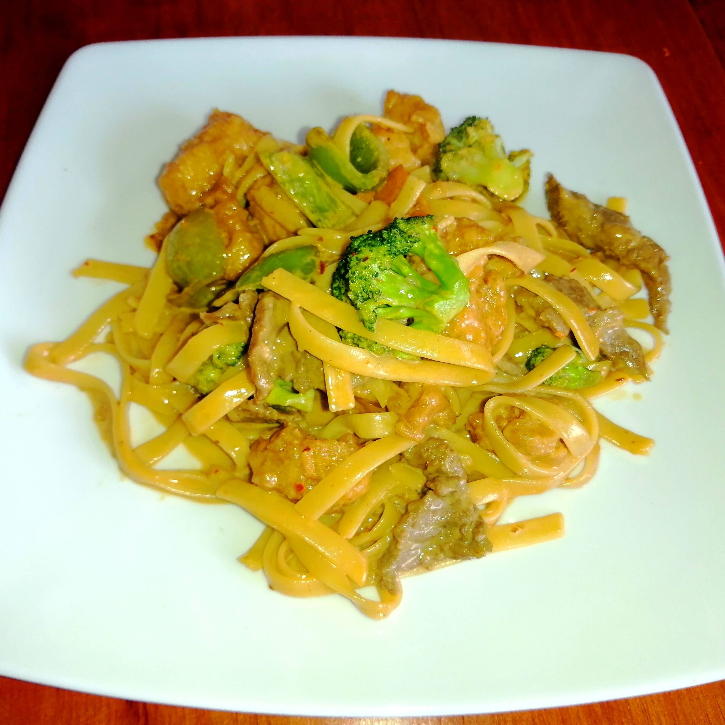 Deliciosos tallarines bañados en aderezo de chipotle con pollo y carne, brócoli, pimiento rojo y zanahoria.