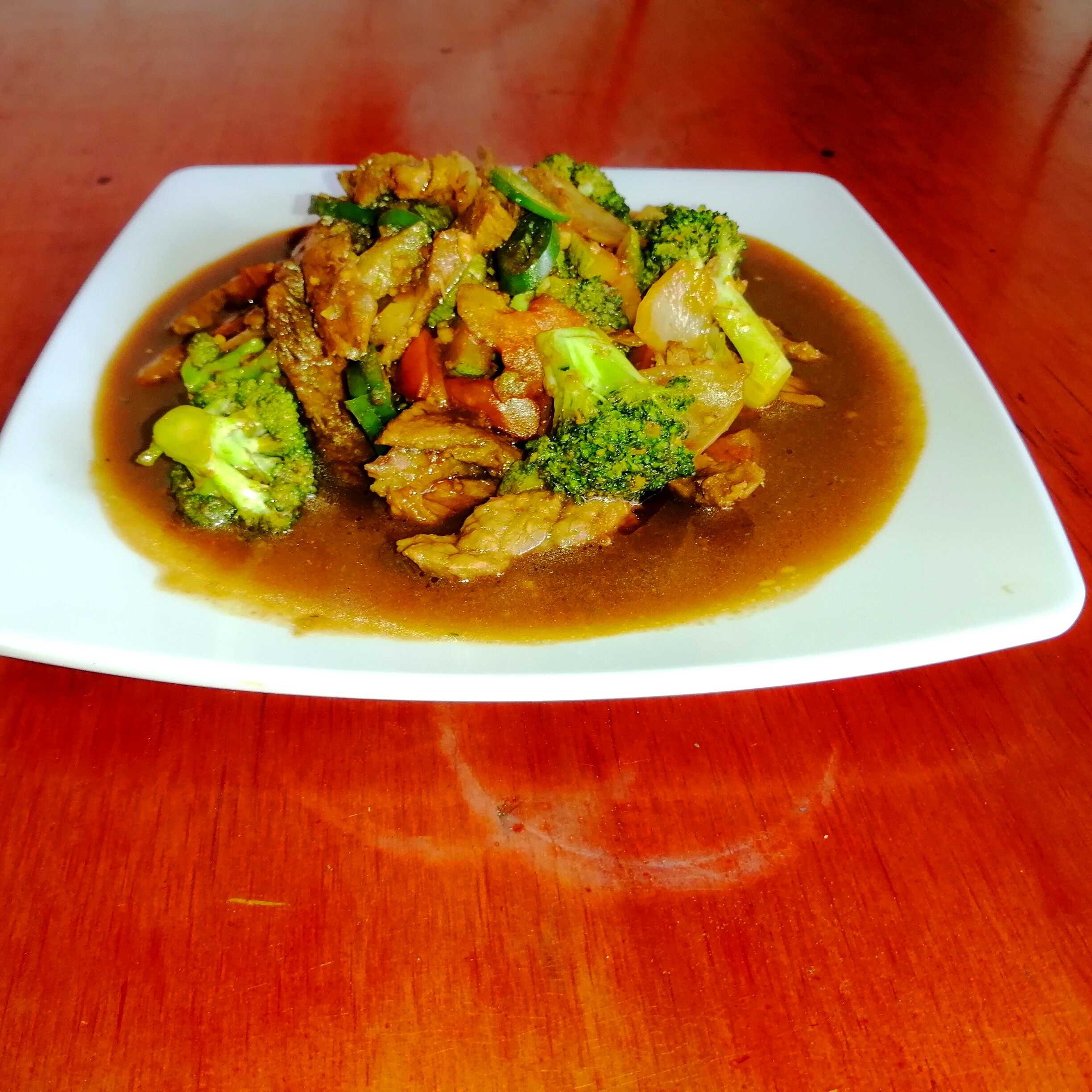 Carne bañada de salsa picante acompañado con cebolla morada, brócoli, chile jalapeño, tomate y calabaza.