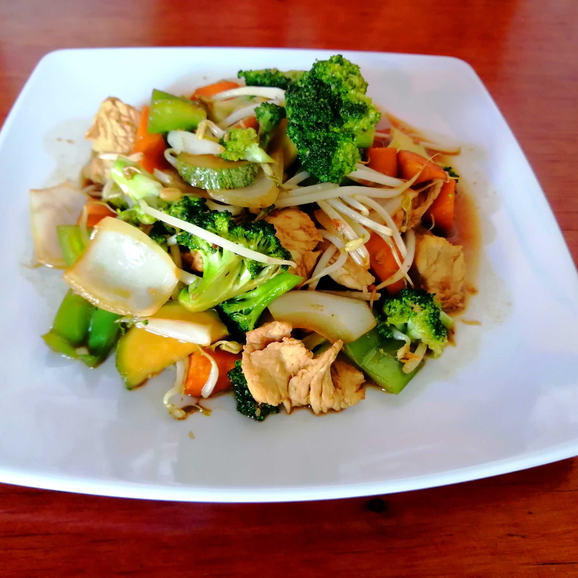 Pollo con brócoli, cebolla blanca, calabaza, pimiento rojo con un toque de pimienta.
