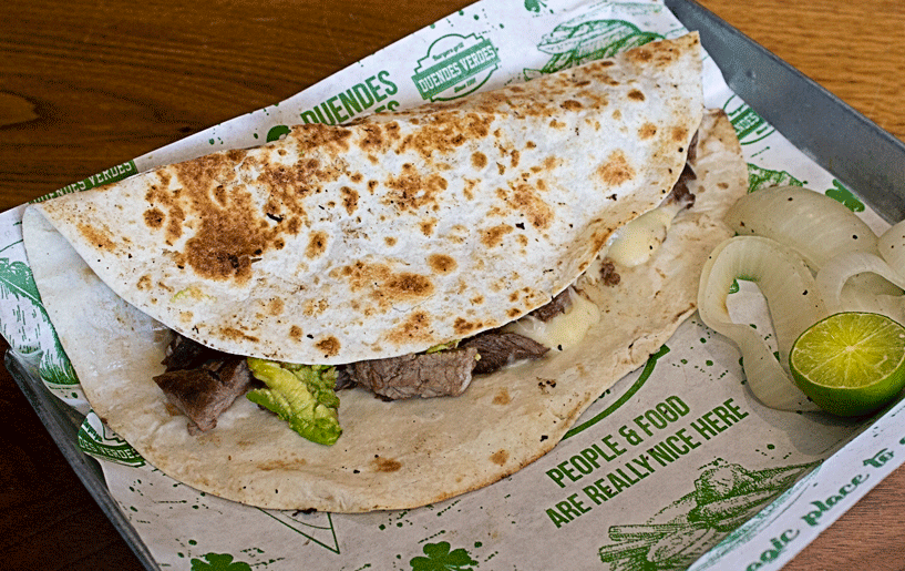 Taco gigante de carne asada con queso y aguacate. En tortilla de harina de 25cm. Acompañado de cebolla asada. Incluye limón y salsas.