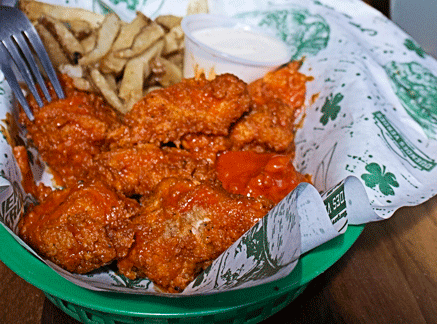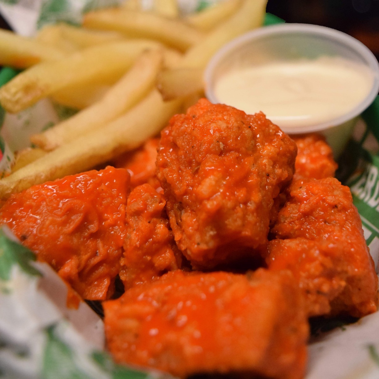 7 Ricos Boneless empanizados bañados en la salsa de tu elección, acompañados de papas a la francesa y aderezo ranch.