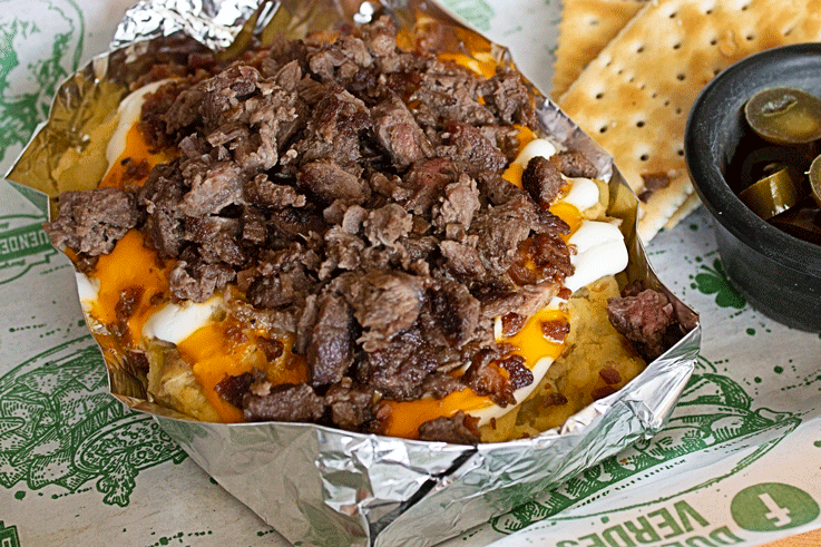 "¡Antojo exquisito! Jugosa papa a la parrilla con tocino, fritura, crema, queso asadero y cheddar más carne asada." Plato personal.