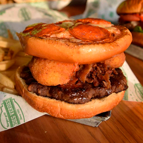 Burger con carne 180 gramos, mix de quesos, pepperoni, tocino con chunks de queso. ¡Un toque italiano! Incluye papas a la francesa.