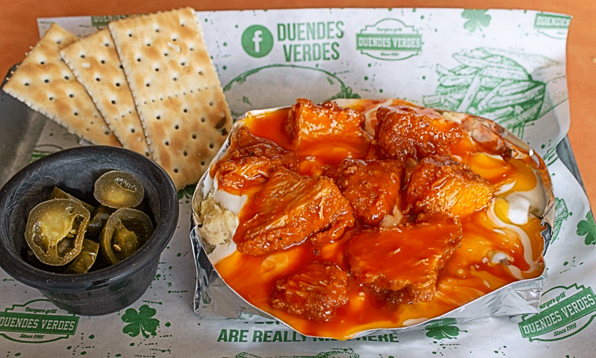 Pechuga empanizada, papas crisscut, bañadas en salsa buffalo, salsa, ranch, salsa de queso, y tocino. ¡Famosisimas!.