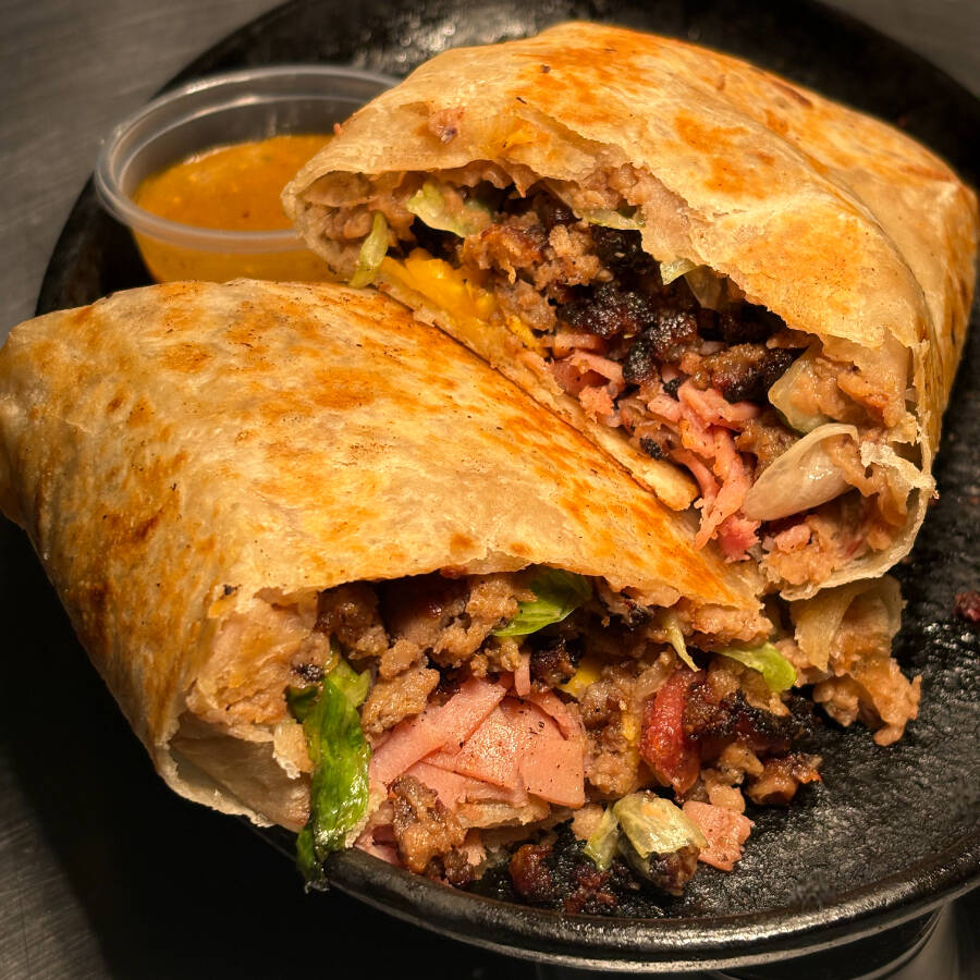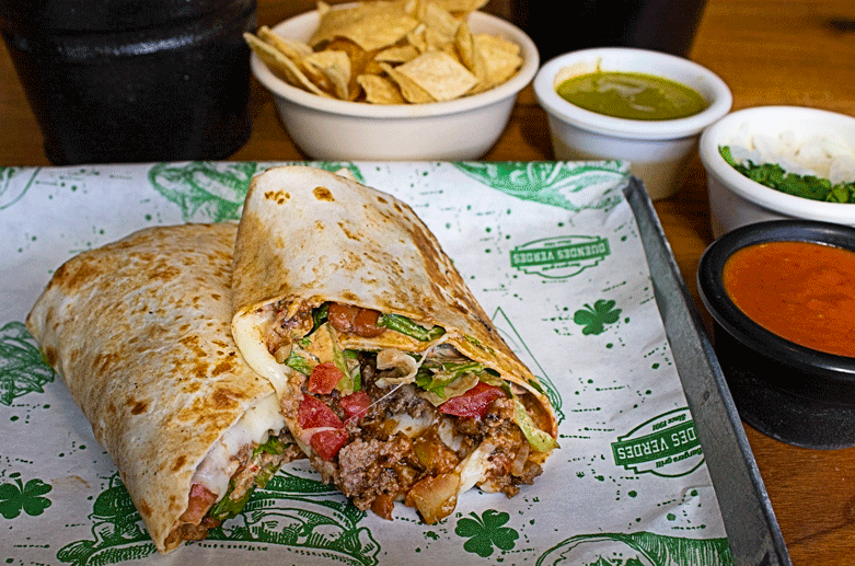 Burrito con sabrosa molida, frijoles refritos, queso americano y fresca lechuga, jamón.
