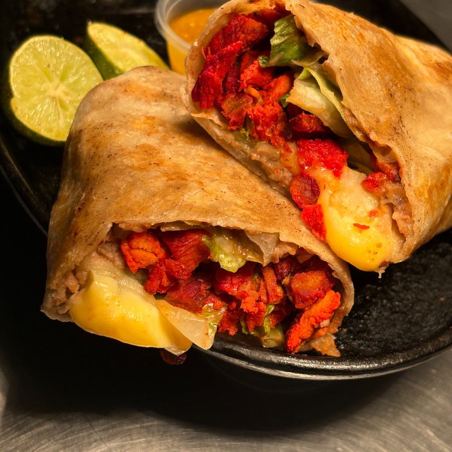 Carne asada, queso chihuahua, cebolla asada, frijol refrito, lechuga y tomate envueltos en tortilla de harina de 30cm.