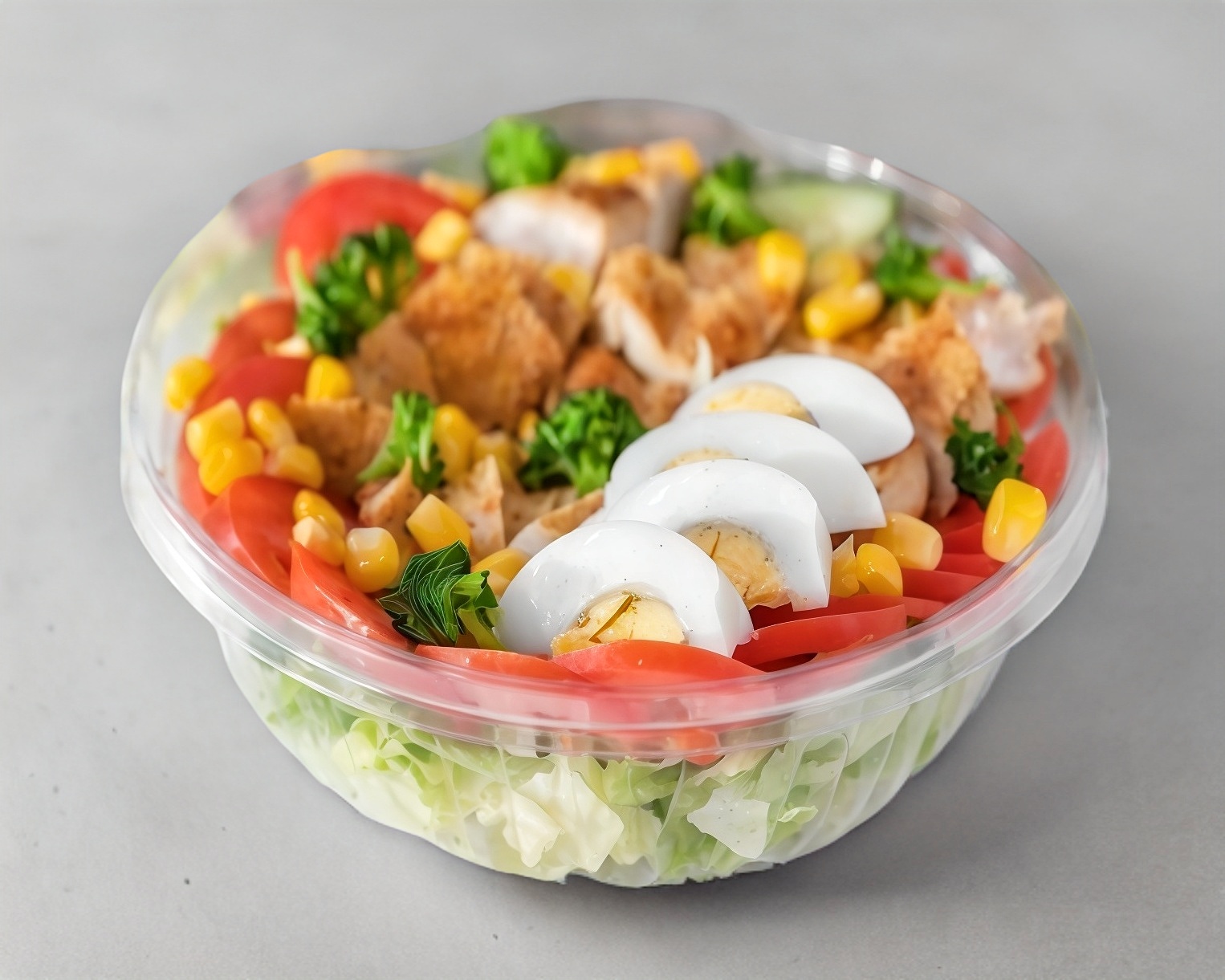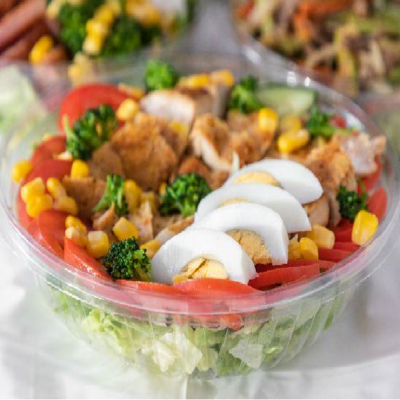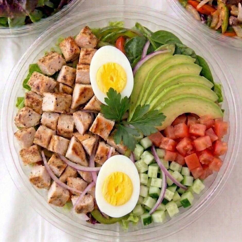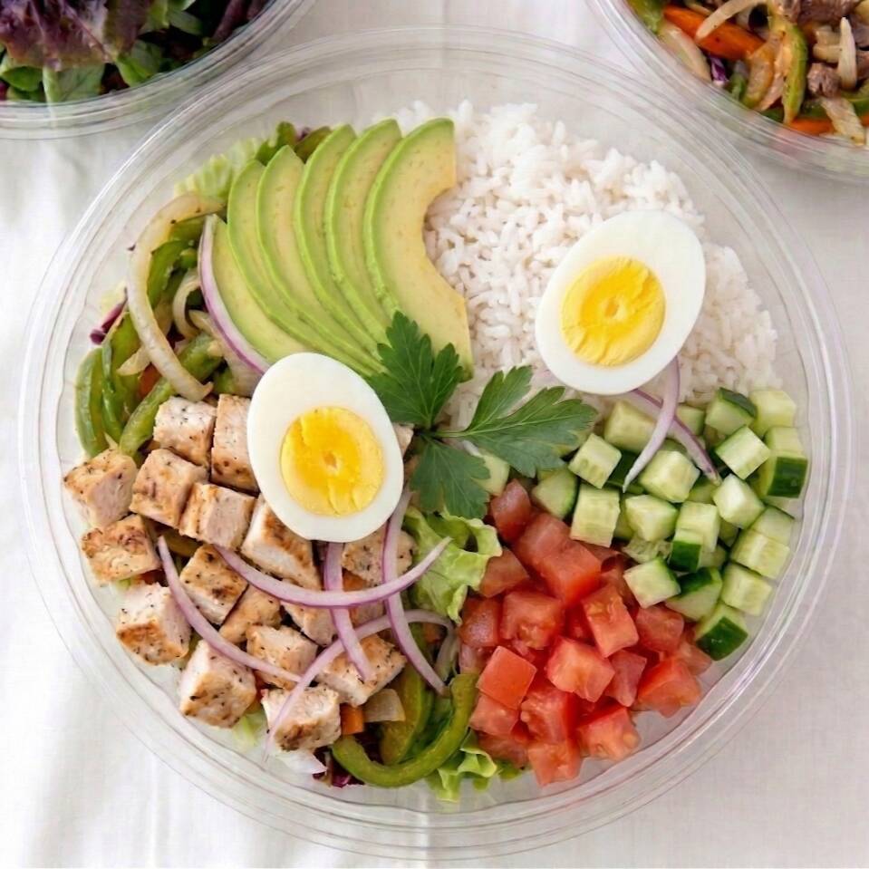 Deliciosa ensalada con pechuga de pollo a la plancha, un huevo cocido, con lechuga, espinaca, pimiento verde, pepino, aguacate, tomate, cebolla morada y aderezo ranch.