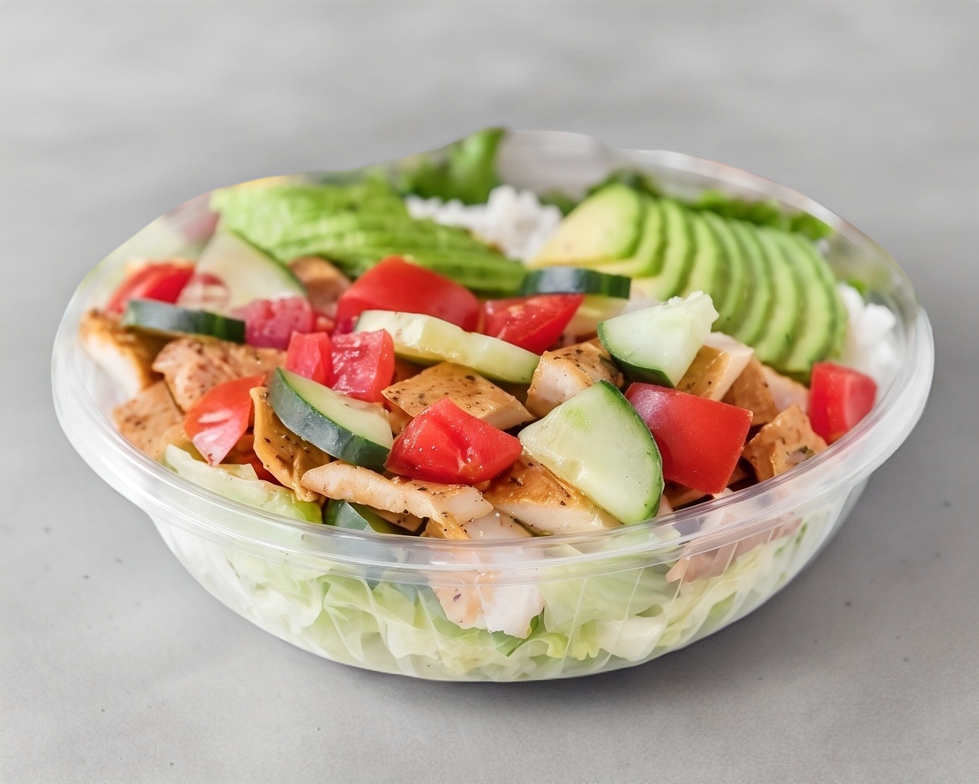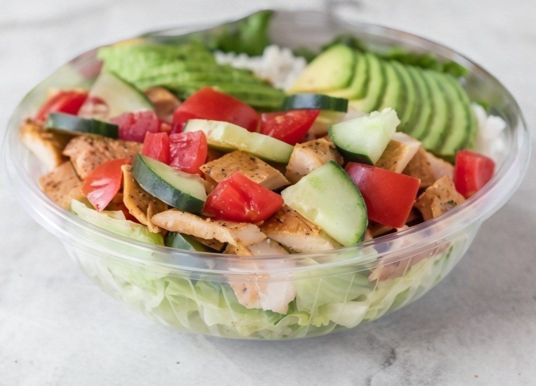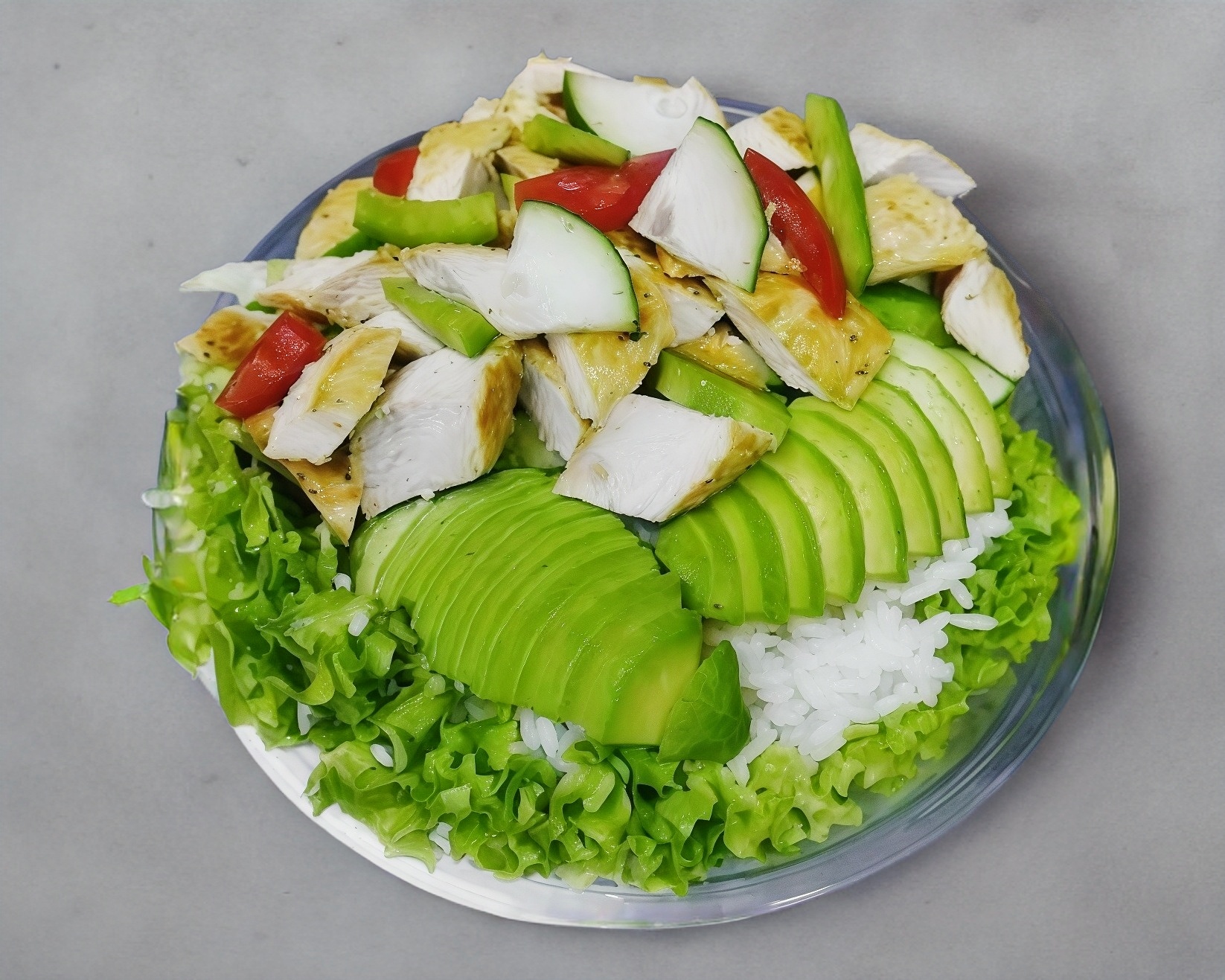 Deliciosos trocitos de pollo a la plancha con arroz blanco a vapor, aguacate sobre una cama de lechuga y vegetales crudos a elegir (tomate, espinaca, cebolla morada, pepino, pimiento verde).
