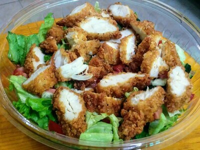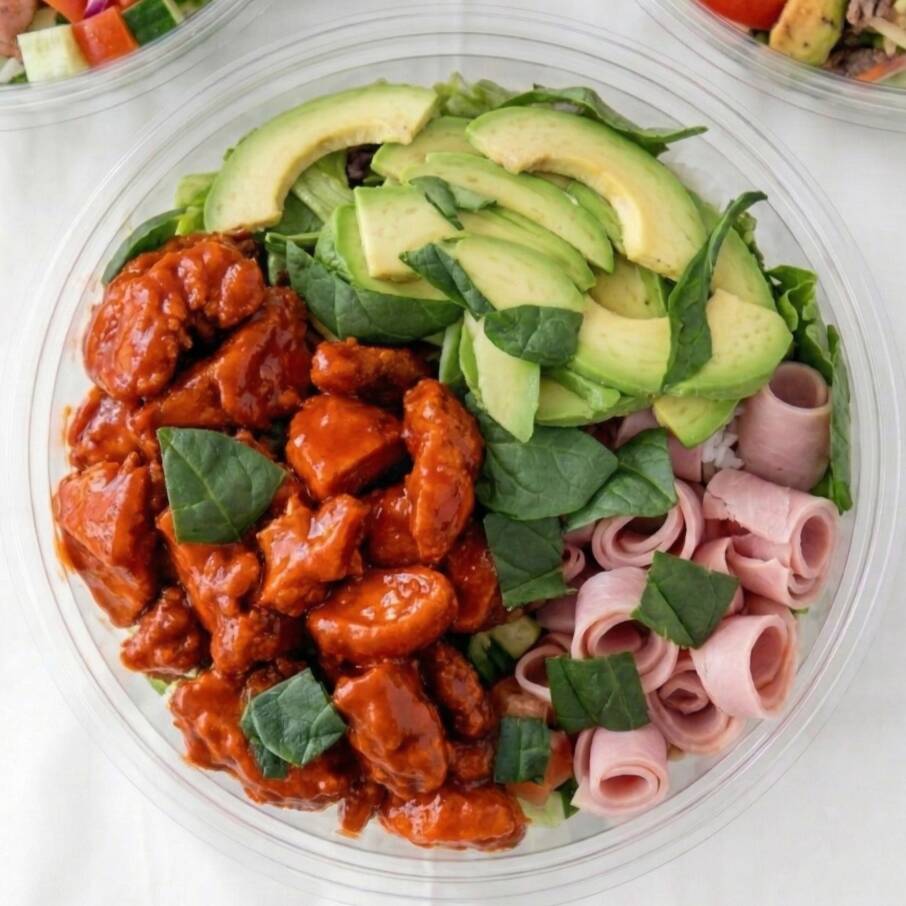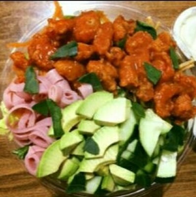 Deliciosa ensalada con fajita crispy bañada en salsa búfalo, acompañada de rollitos de jamón, aguacate, lechuga y vegetales a tu elección.