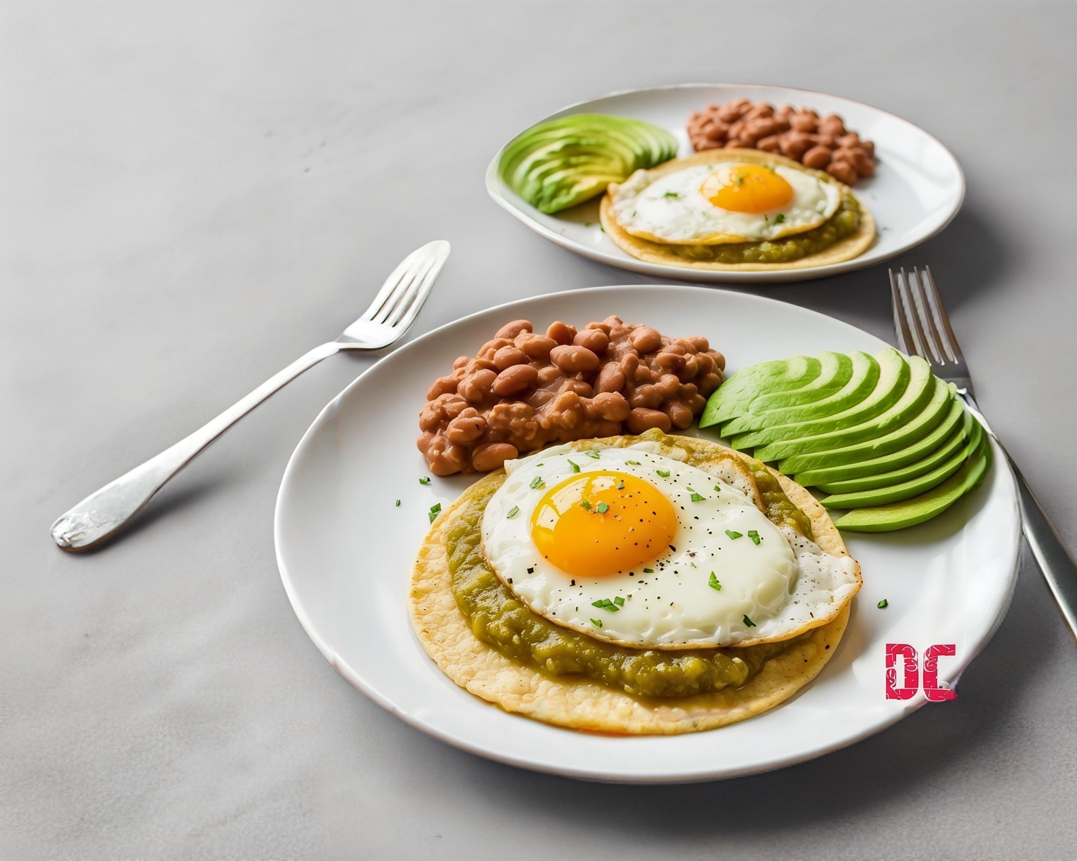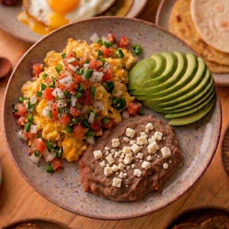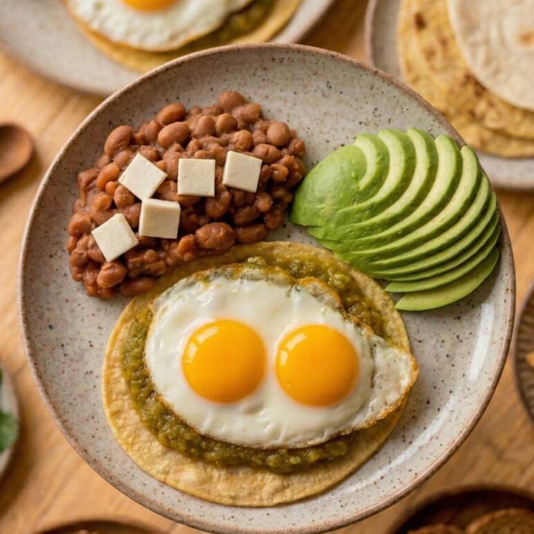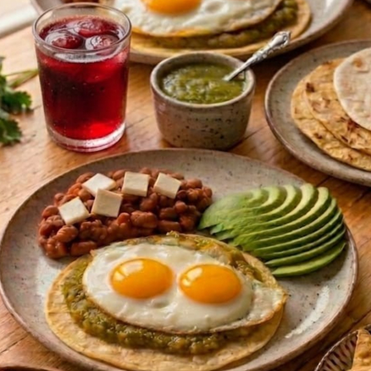 2 Huevos estrellados bañados en salsa verde con aguacate y acompañado de frijoles refritos queso blanco.