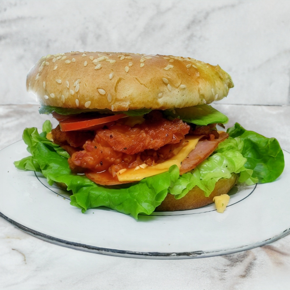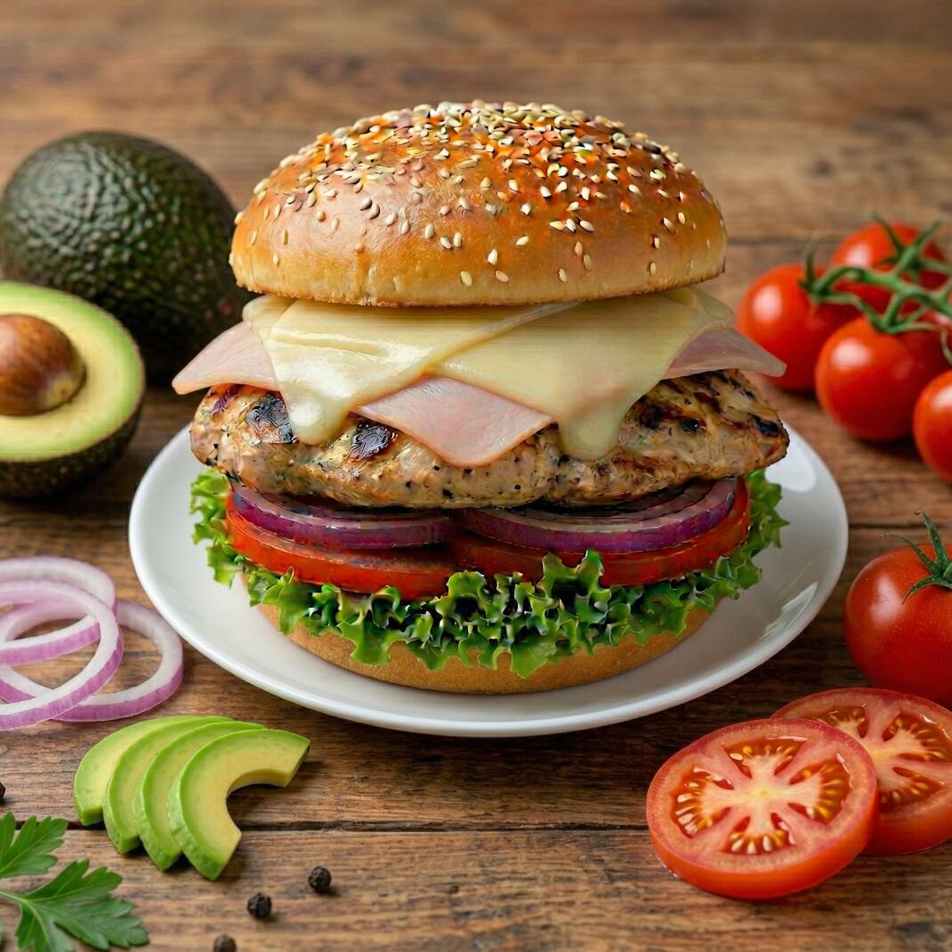 Deliciosa hamburguesa de pechuga de pollo asada a la plancha, jamón, queso manchego blanco, lechuga, tomate, cebolla más papas deshidratadas.