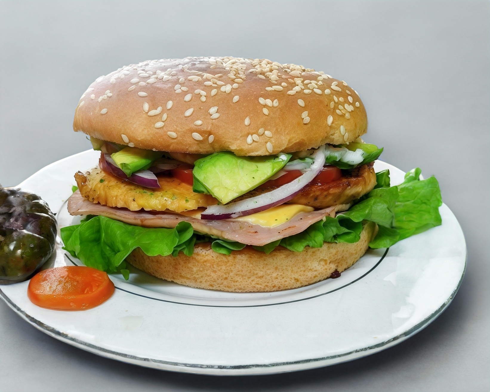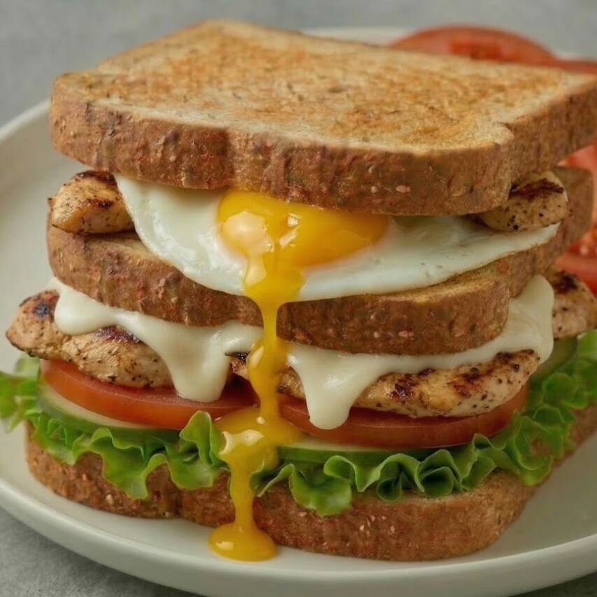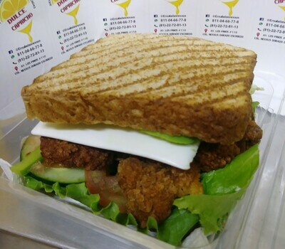 Delicioso sándwich de tres pisos con pechuga de pollo, 1 huevo estrellado, jamón de pavo, queso manchego, espinaca, aguacate y cebolla morada. Puedes elegir entre porción de ensalada o porción de papas deshidratadas. ( No se puede modificar, si requiere alguna sándwich de forma especial ve a arma tu sándwich y ahí podrás armar tu sándwich a tu gusto).