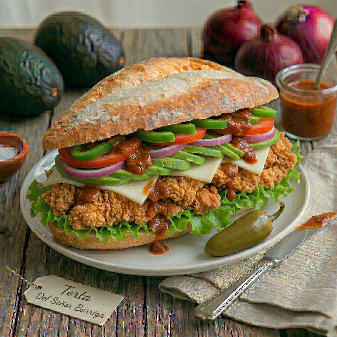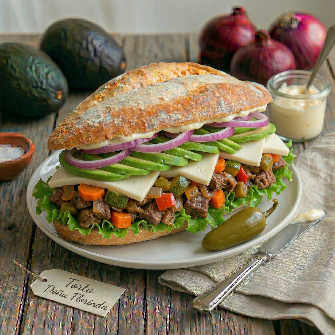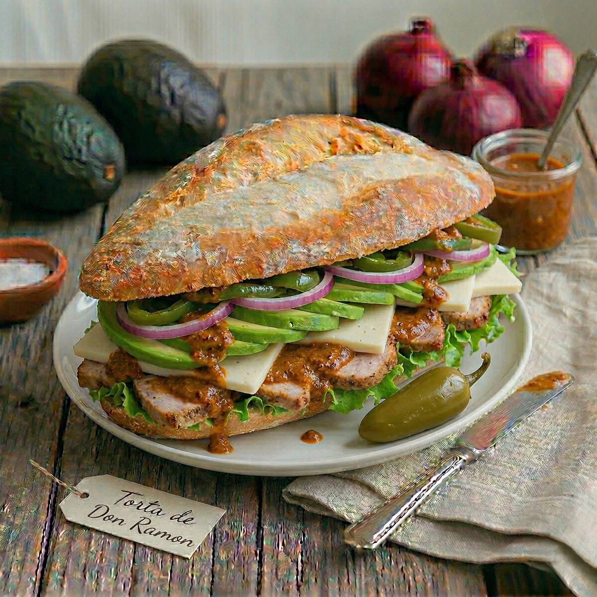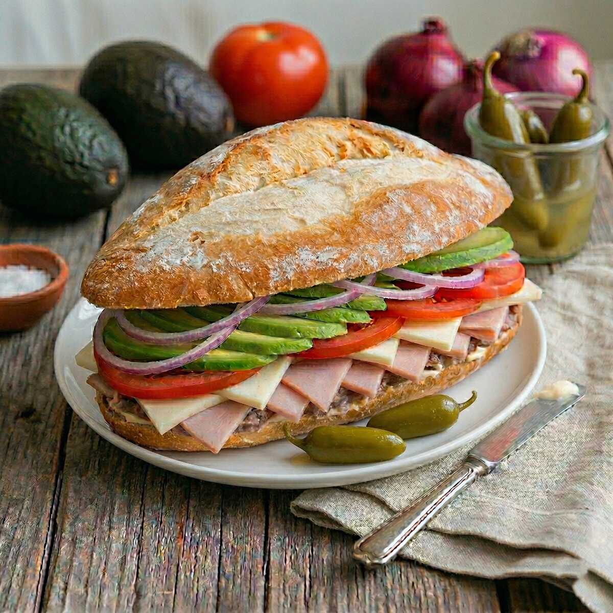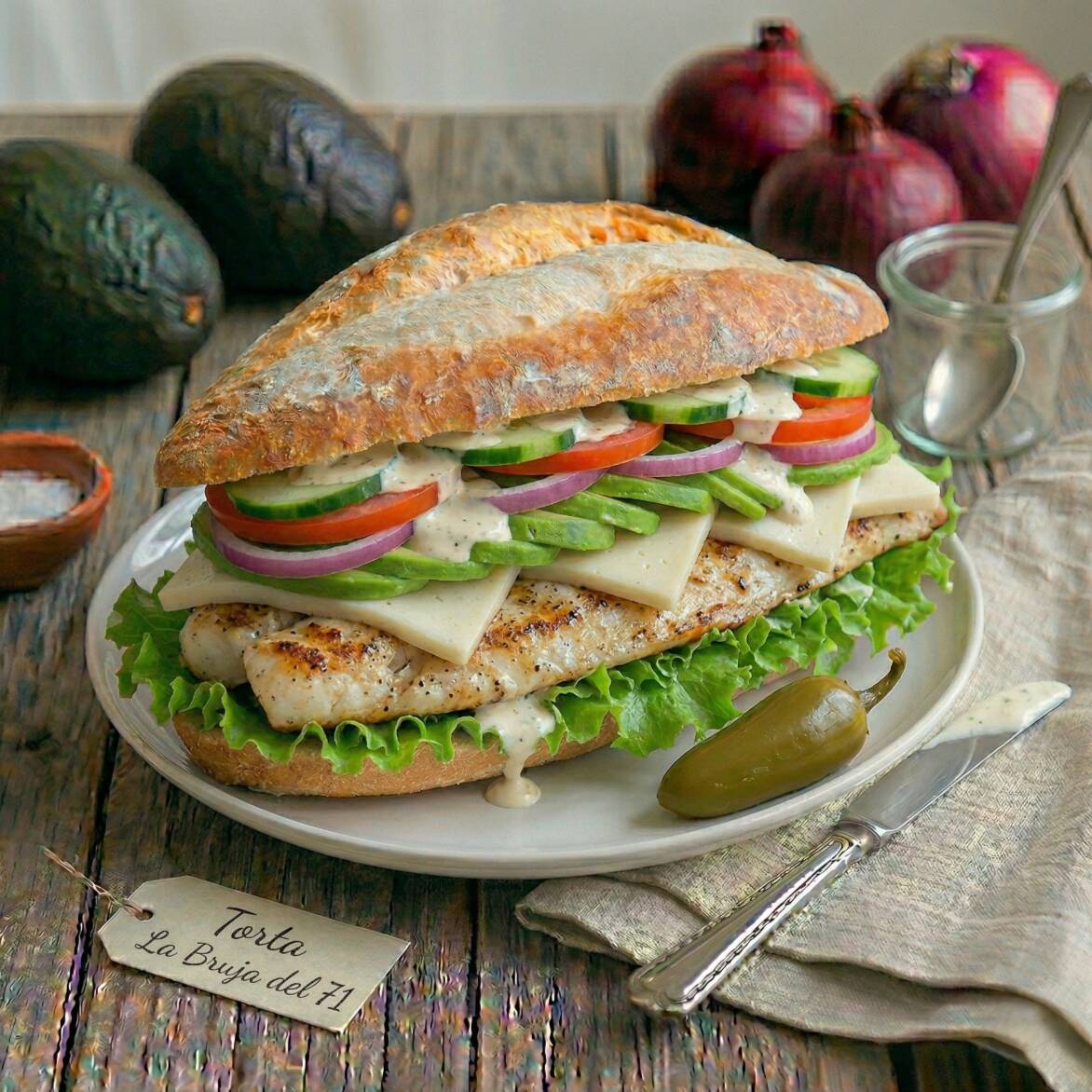 Deliciosa torta en pan torreón fresco, jamón, queso panela, aguacate, tomate, cebolla morada y mayonesa.