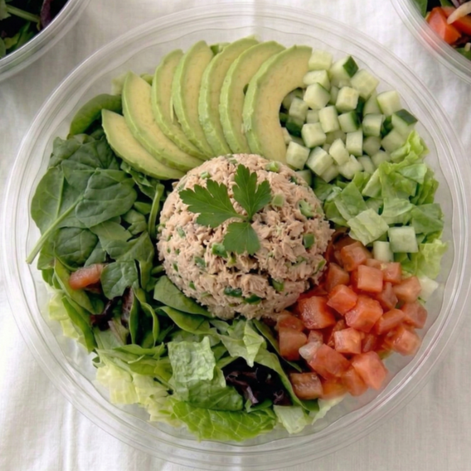 Atún con mayonesa sobre una cama de lechuga romana, espinaca, pepino, pimiento verde, aguacate, tomate y cebolla morada.