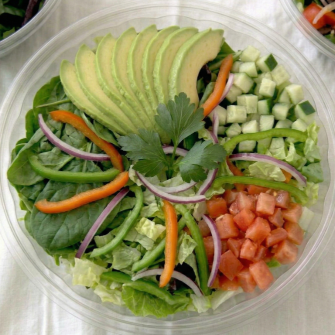 Deliciosa ensalada con lechuga, Aguacate, espinaca, pimiento verde, pepino, tomate, cebolla morada y aderezo ranch.