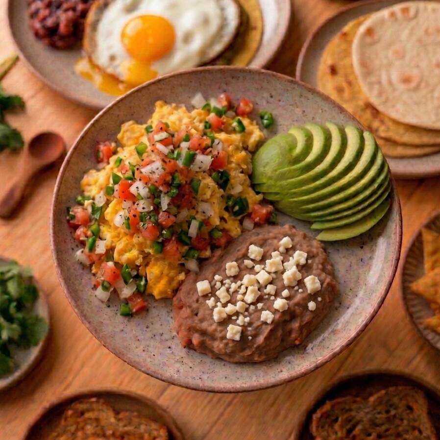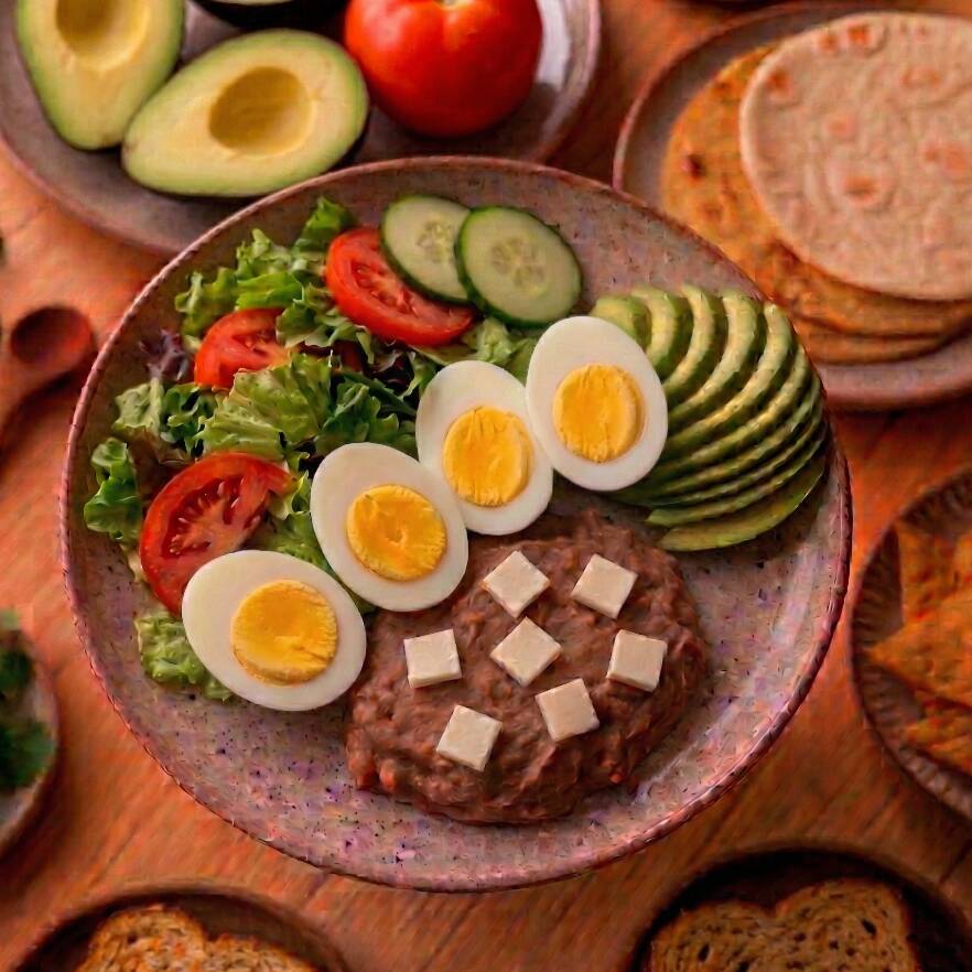 2 Huevos Cocidos, Con porcion de ensalada(Lechuga, Tomate, Pepino), Aguacate, Acompañados de Frijoles Refritos, con queso blanco