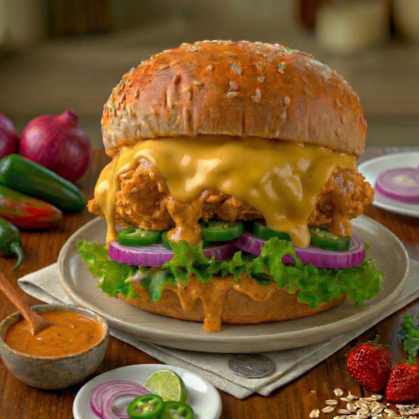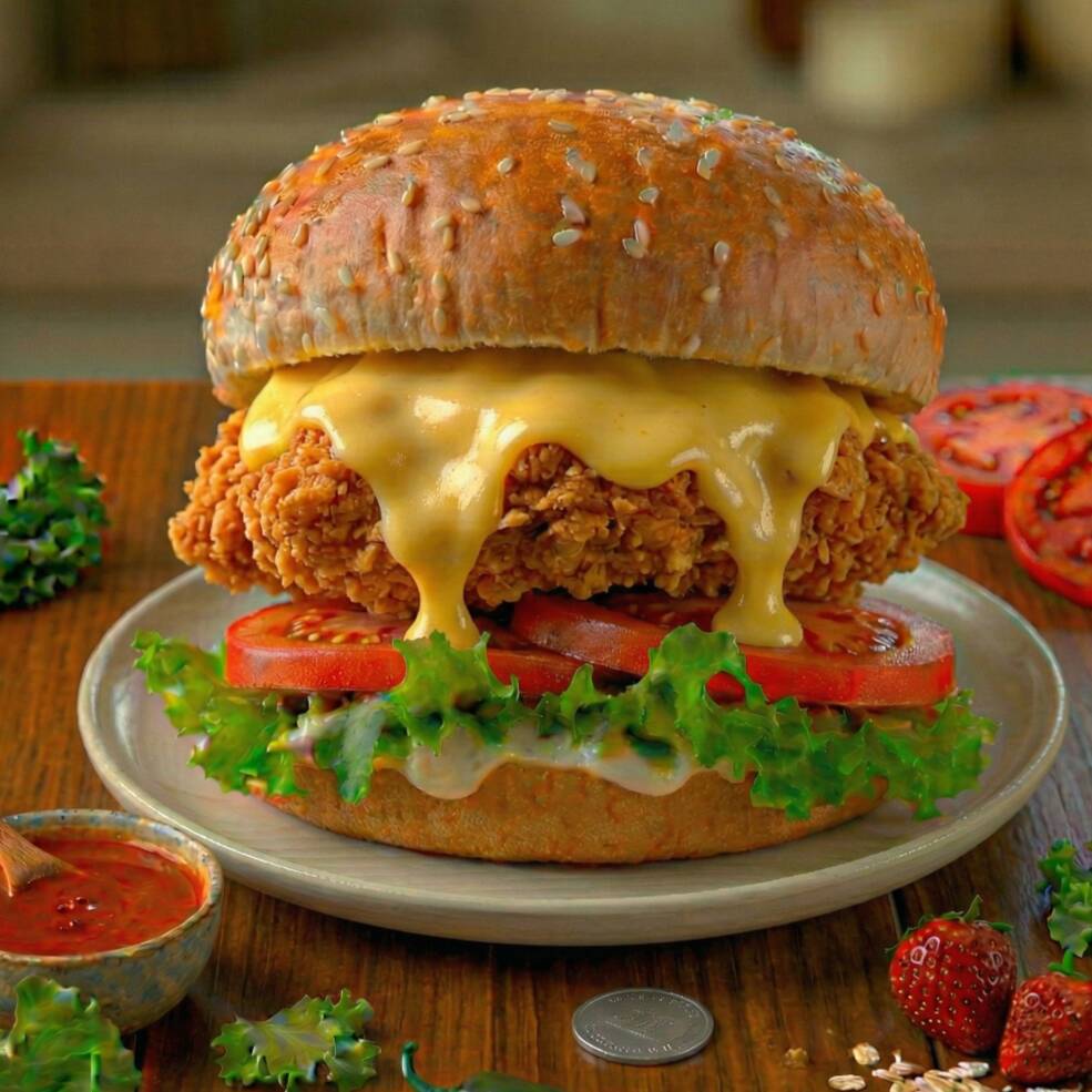 Deliciosa hamburguesa con fajita de pollo cruji bañada en aderezo ranch, queso amarillo, lechuga, tomate más papas deshidratadas.