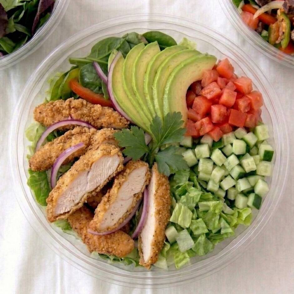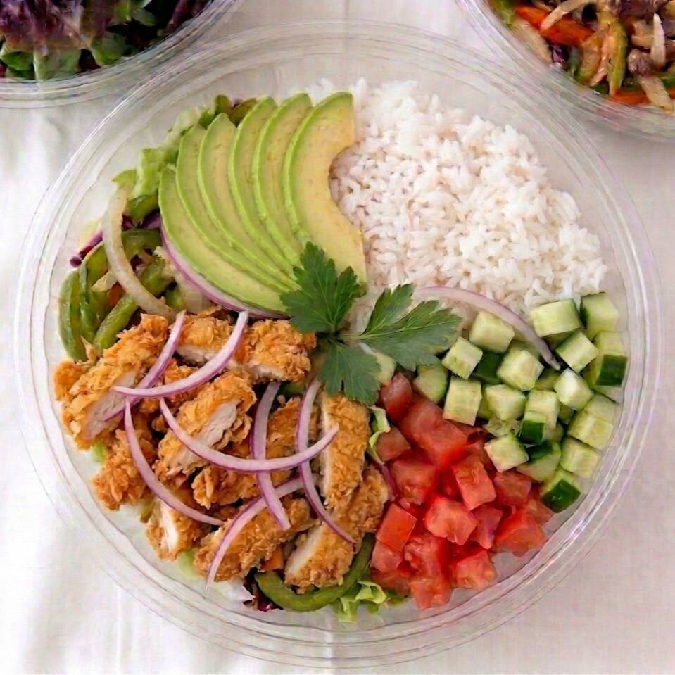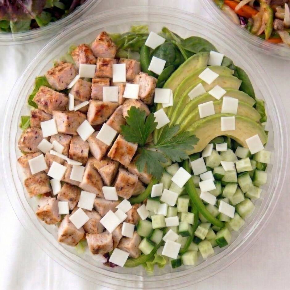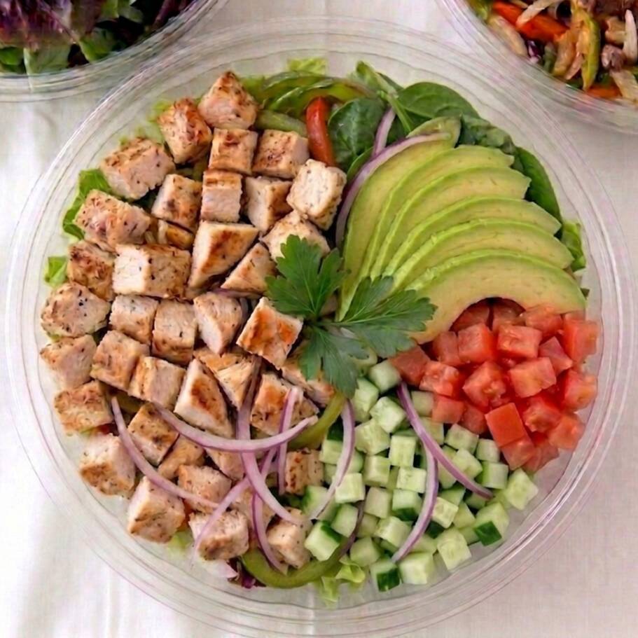 Deliciosa ensalada con pechuga de pollo a la plancha, lechuga, aguacate, vegetales a elegir (espinaca, pimiento verde, pepino, tomate, cebolla morada).