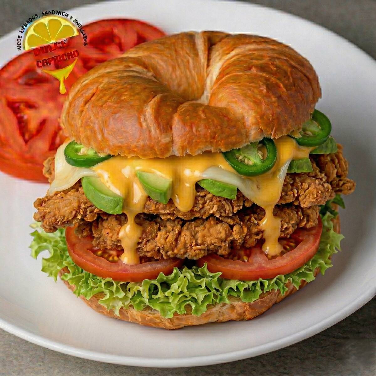 "¡Un festín de texturas! Crujientes fajitas de pollo tipo tender doradas a la perfección, cubiertas con queso amarillo fundido y una base cremosa de aderezo de chipotle. Servido con el frescor de la lechuga italiana, rodajas de tomate jugoso, láminas de aguacate y el toque picante de nuestros chiles jalapeños. Todo dentro de un croissant hojaldrado artesanal."