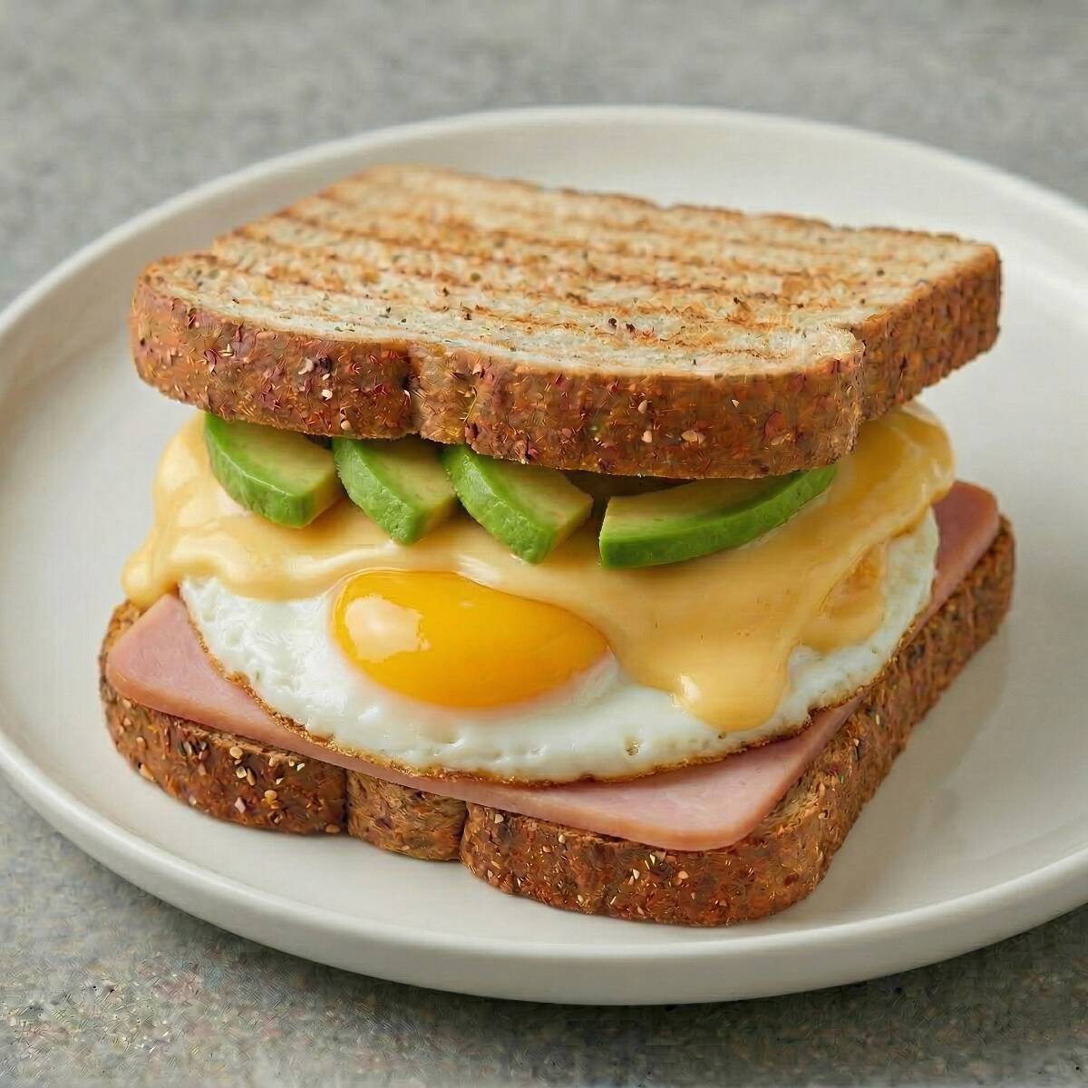 Riquísimo sándwich con huevo estrellado, jamón, queso americano, aguacate, mayonesa. Puedes elegir entre porción de ensalada o porción de papas deshidratadas, (no se puede modificar, si requiere algún sándwich de forma especial ve a arma tu sándwich y ahí podrás armar tu sándwich a tu gusto).